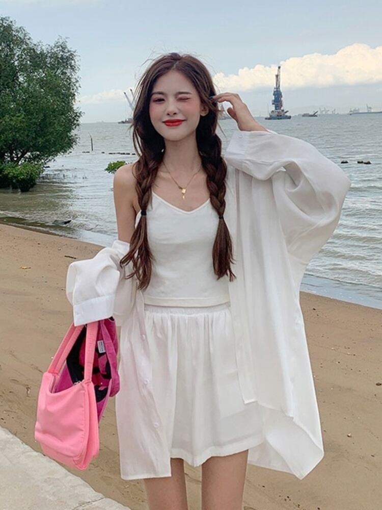 [EWQ] ビーチ ウェア 2 点セット日焼け止めカーディガン シャツ トップ + ワイドレッグ ショーツ春夏シック ルーズ スーツ 6126 スプリング 春物 サマー 夏物 ブルマー ワイドパンツ