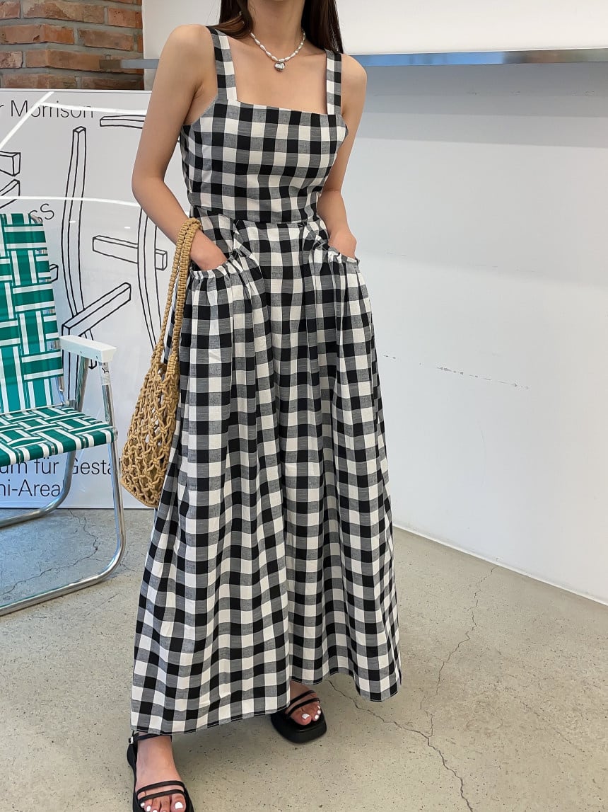 [EWQ] スクエア ネック プリーツ ダブル ポケット スリング ドレスチェック柄コントラスト カラー ノースリーブ ドレス夏 6Y7558 サマー 夏物 スクウェア