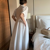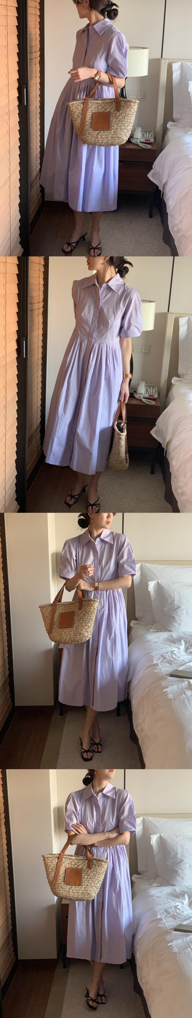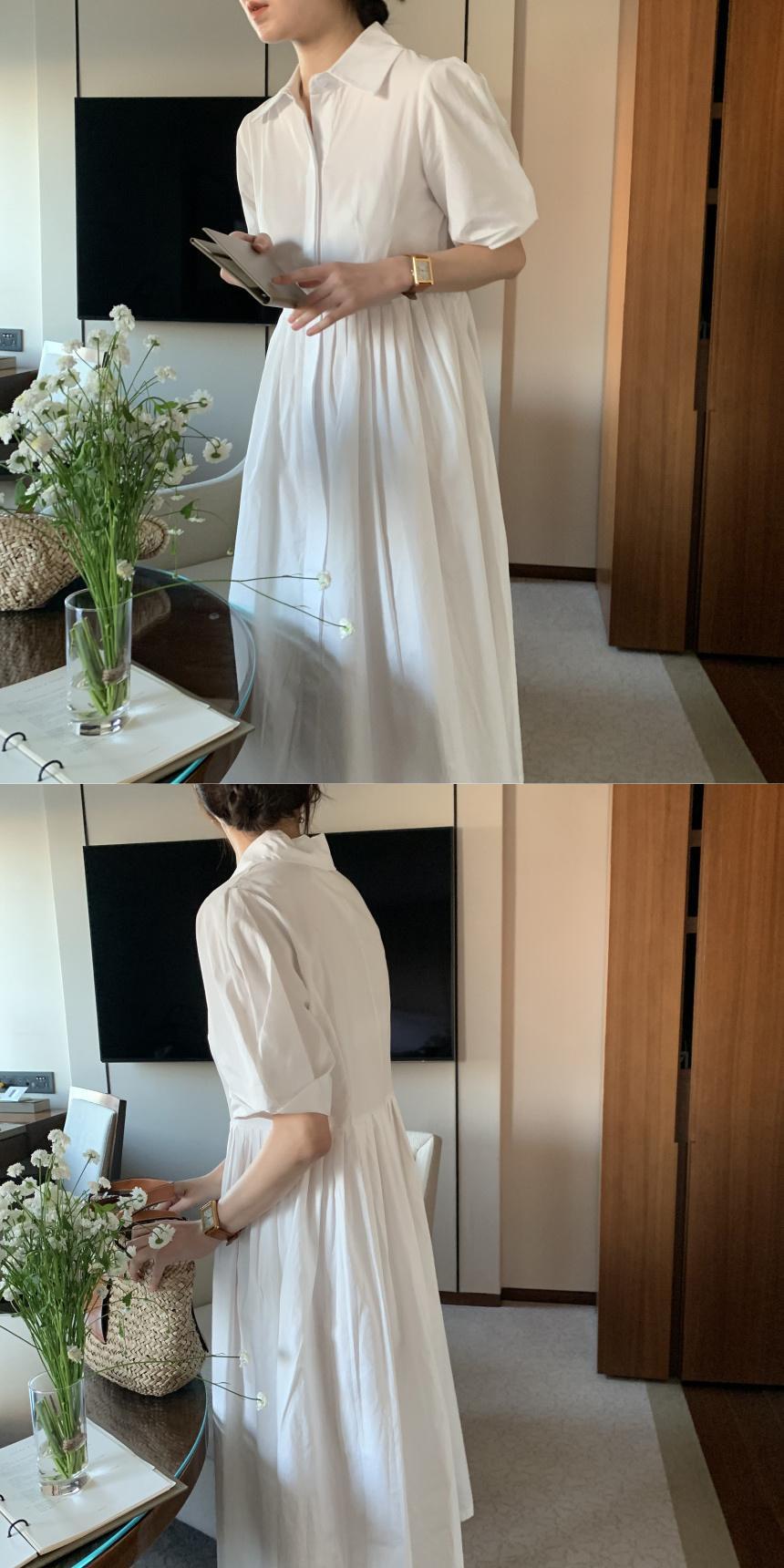 [EWQ] ラペル プリーツ ウエスト ドレス シングル ブレスト無地シャツ マキシ ドレス夏パフ スリーブ Vestido サマー 夏物 ソリッドカラー