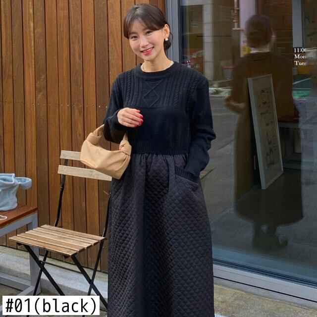 [EWQ] シック秋春 O ネック スプライス ニット ロング コットン ドレス美しい黒 Vestidos Y5527G ブラック スプリング 春物 オータム 秋物 Oネック