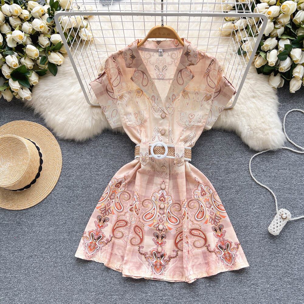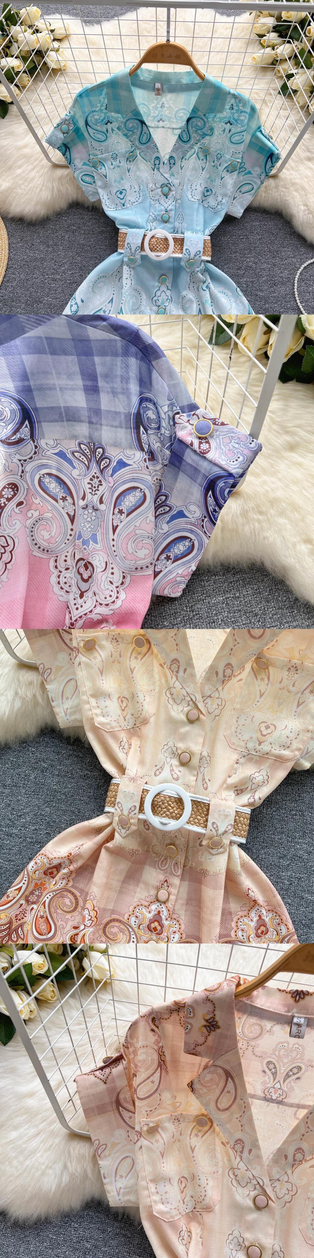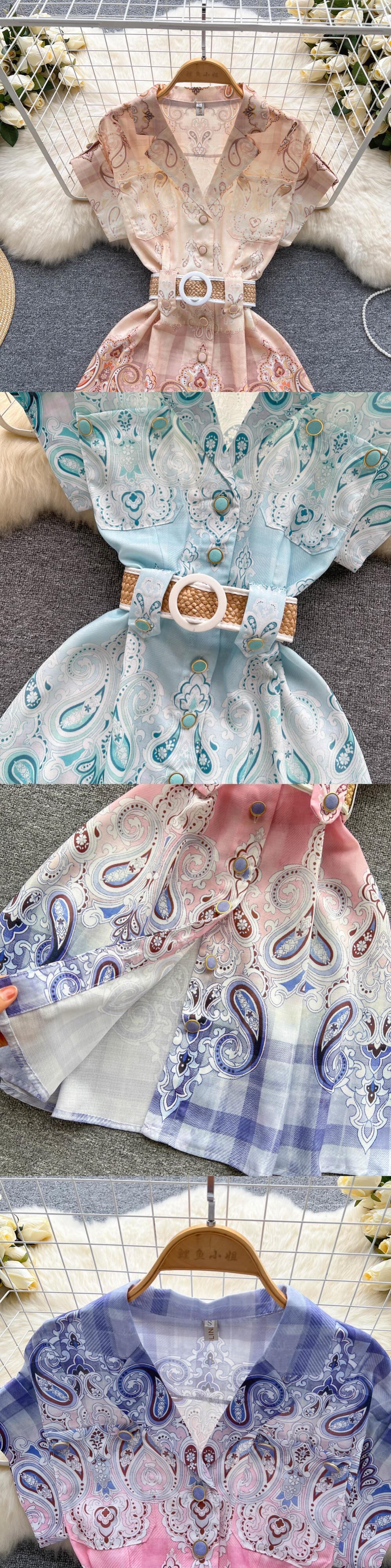 [EWQ] レディース プリント カラー コントラスト 半袖 ワンピース シングルブレスト レースアップ プリント パーティー Vestido 春夏 6Y6162 ショート ハーフスリーブ スプリング 春物 サマー 夏物