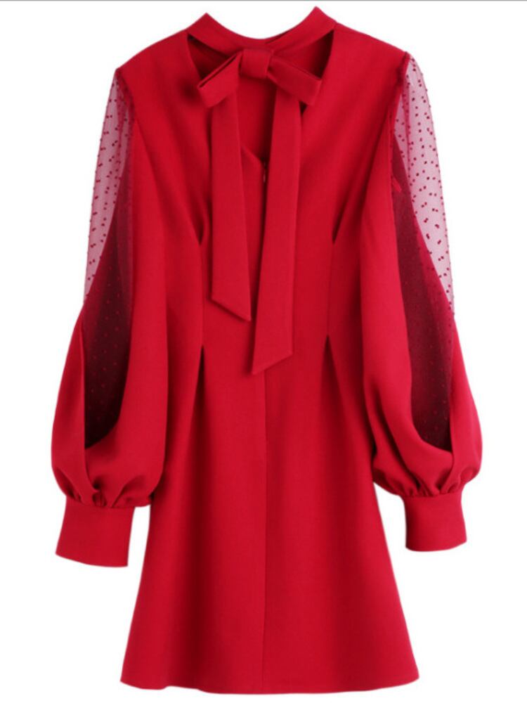 [EWQ] メッシュ パッチワーク ランタン スリーブ Vestido 春夏トレンド シックボウタイ美しいパーティー ドレス 16Y6109 ランタンスリーブ リボン スプリング 春物 サマー 夏物