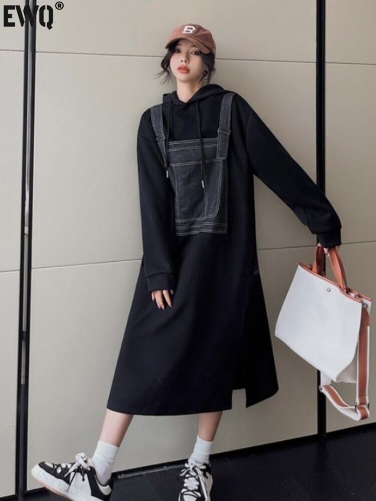[EWQ] 長袖フード付きデニムスプライシングスウェットシャツドレス春秋潮特大ドレスストレート Rode 16Y58 ロング スプリング 春物 オータム 秋物