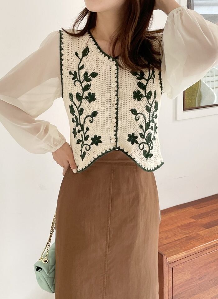 【EWQ】春刺繍フラワーカットアウトメッシュ長袖シャツVネックスプライスショートトップニットステッチブラウス ロング スプリング 春物 フラワーデザイン