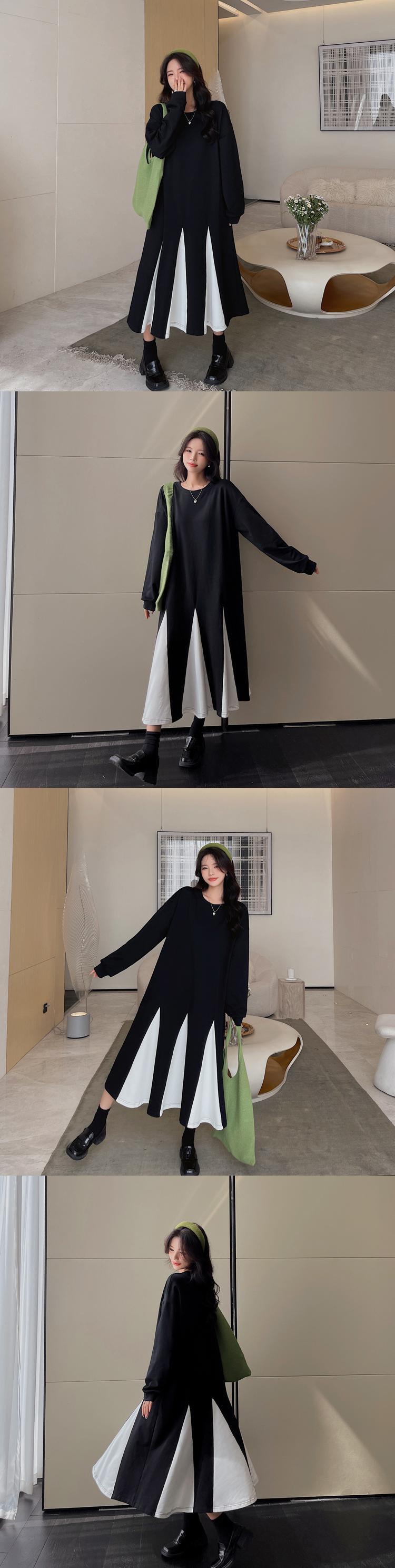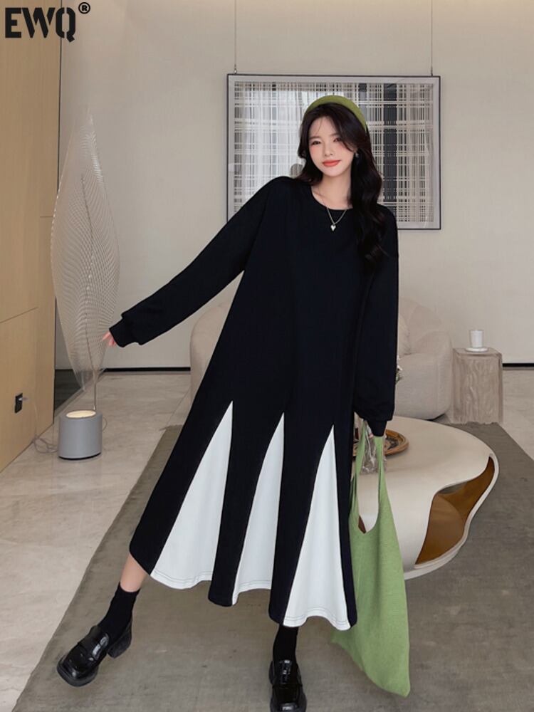 [EWQ] 長袖カラー コントラスト スプライシング トランペット ドレス春秋ミニマリスト スウェットシャツ ドレス Rode 16Y5829 ロング スプリング 春物 オータム 秋物