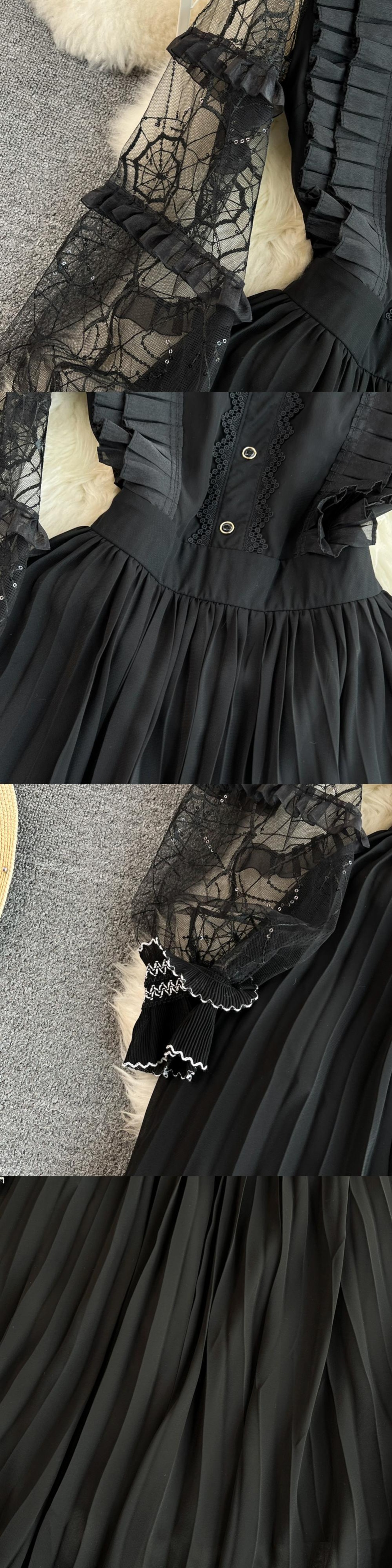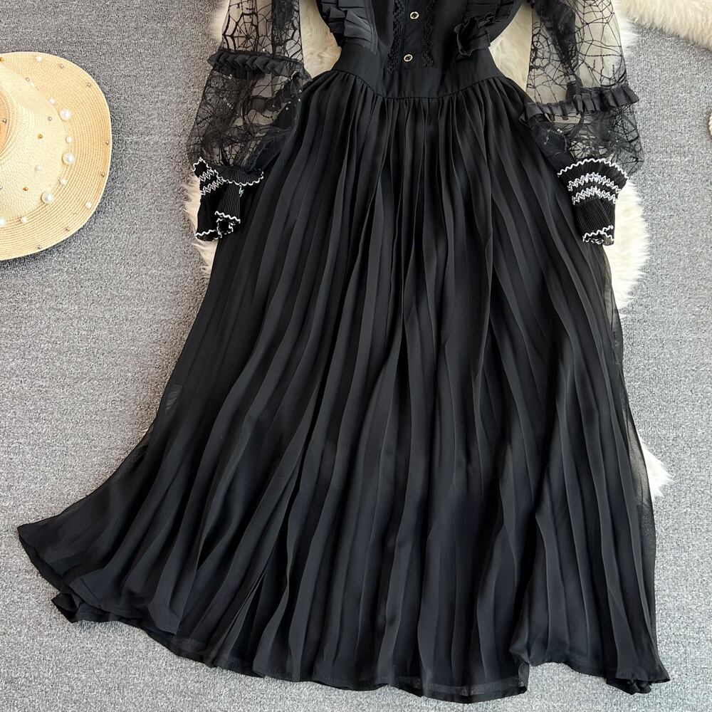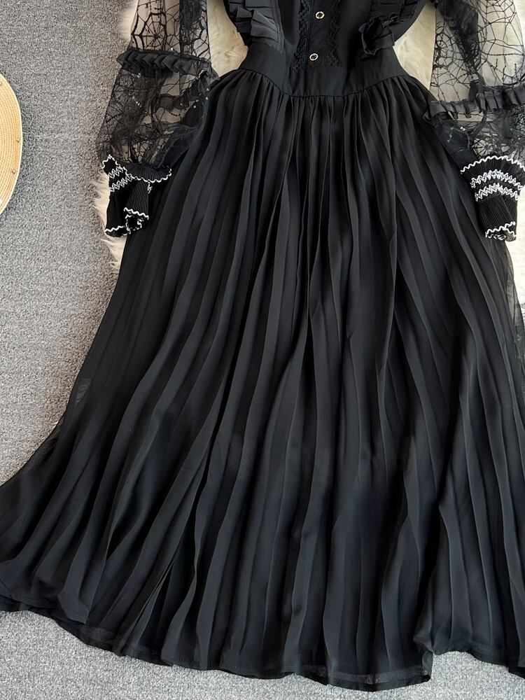 [EWQ] O ネック フリル スプライス ドレス ウエスト スリム プリーツ ドレス 春潮 メッシュ 長袖 Vestido 6Y8028 ロング スプリング 春物 Oネック