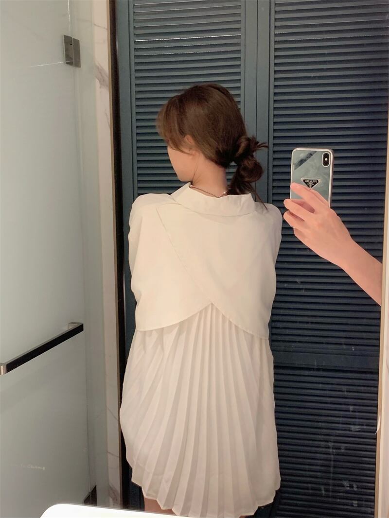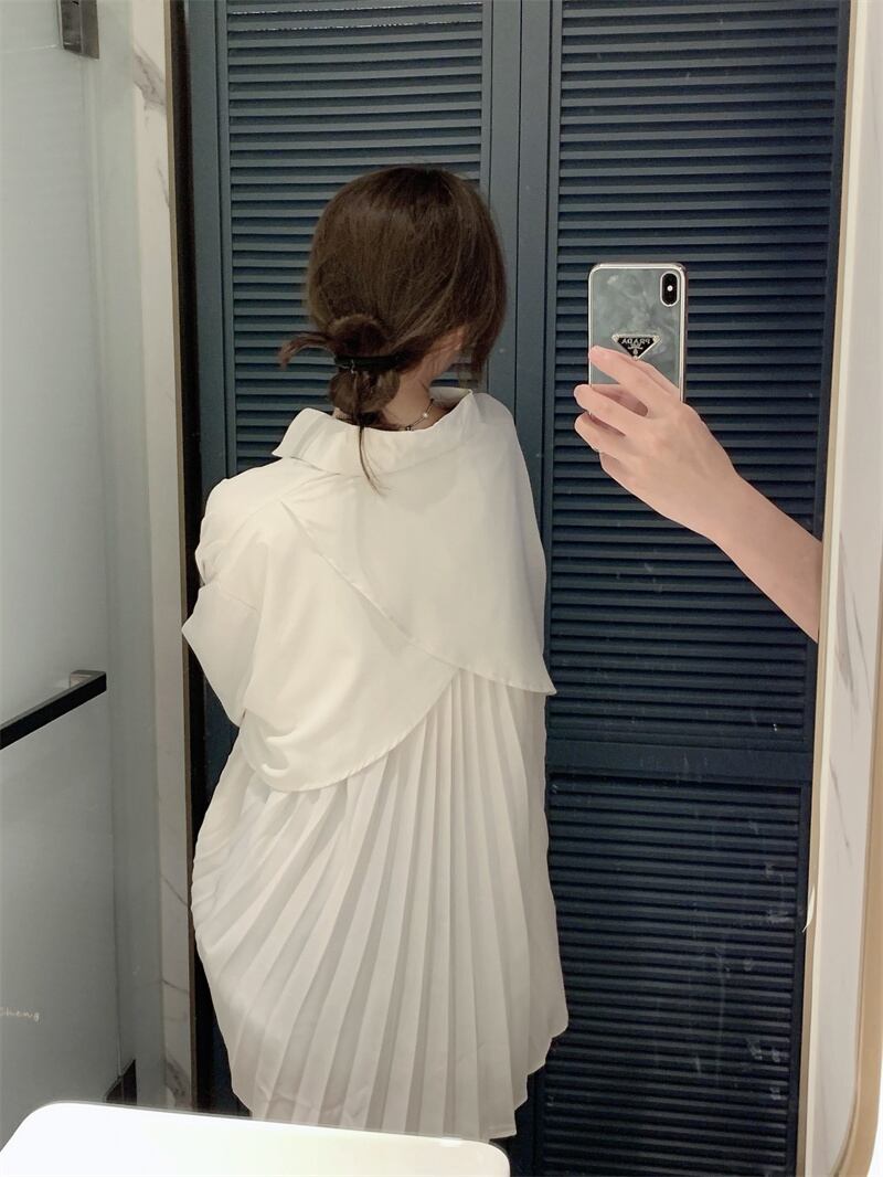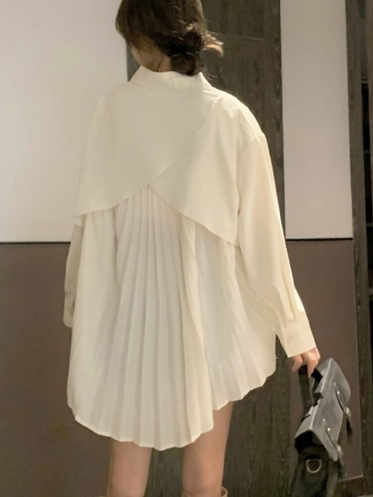 [EWQ] ミニマリスト バック プリーツ クロス シャツ春秋トレンド シックターンダウン カラー ブラウス トップス 6651 スプリング 春物 オータム 秋物
