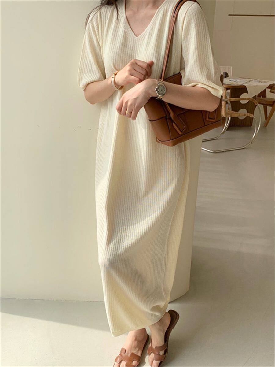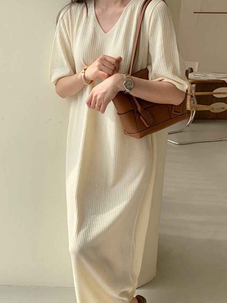 [EWQ] レディース Vネック ゆったり 無地 ニットワンピース 夏 半袖 ニットワンピース Vestido Y7268 ショート ハーフスリーブ サマー 夏物 ドレス ソリッドカラー