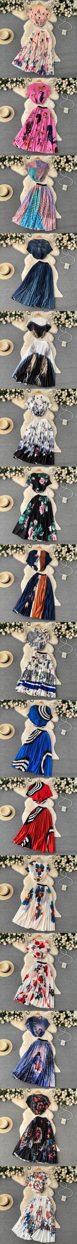 【EWQ】レディース プリントスーツ フラワー 半袖トップ+ハイウエストプリーツスカート 春夏20色ツーピースセット ハイウェスト ショート ハーフスリーブ スプリング 春物 サマー 夏物 フラワーデザイン