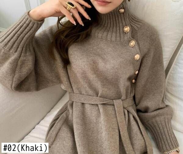 【EWQ】シック秋冬着回しルーズ万能衿ツーレースアップウエストパーティーニットワンピ オータム 秋物 ウィンター 冬物