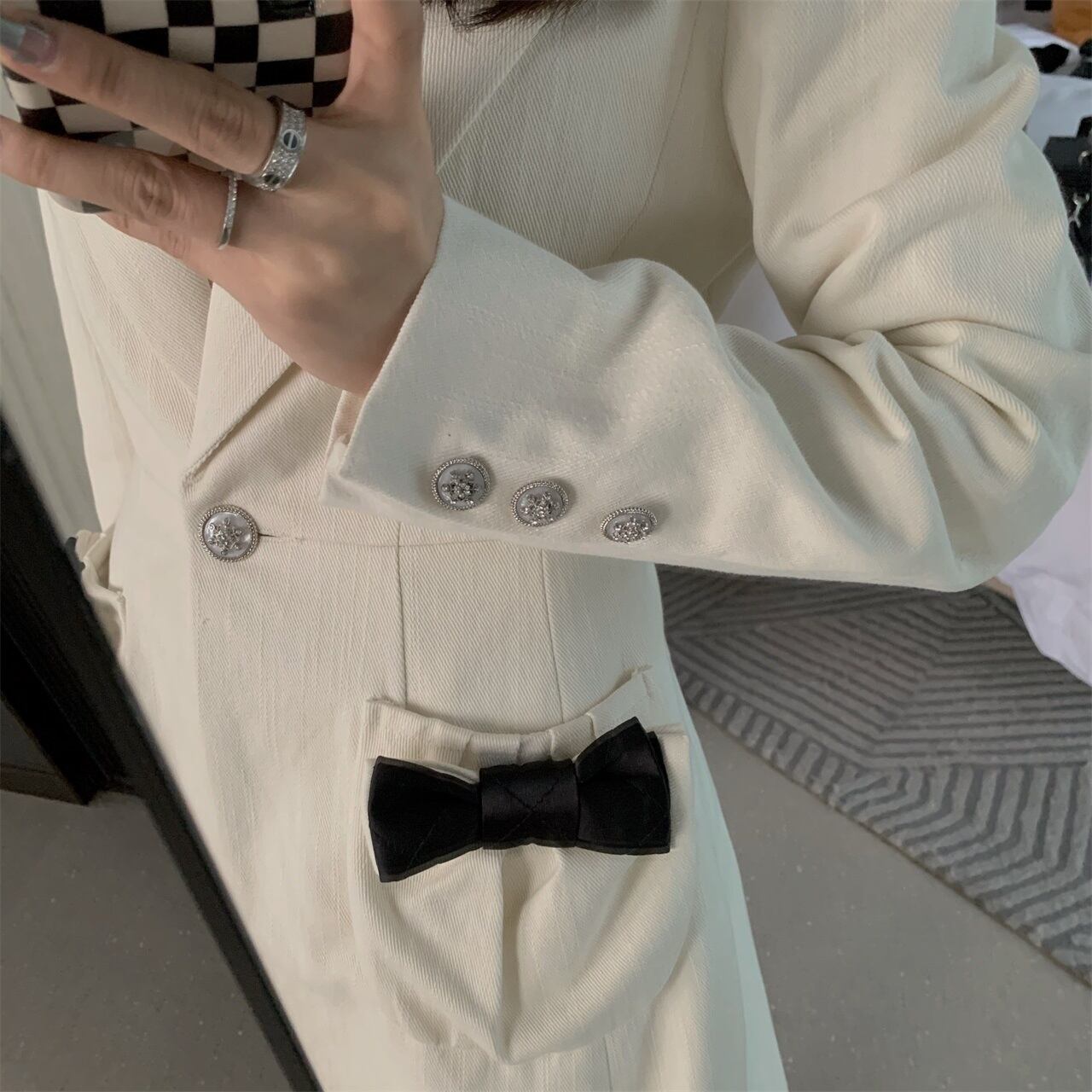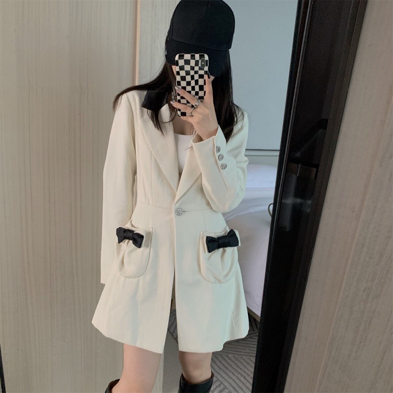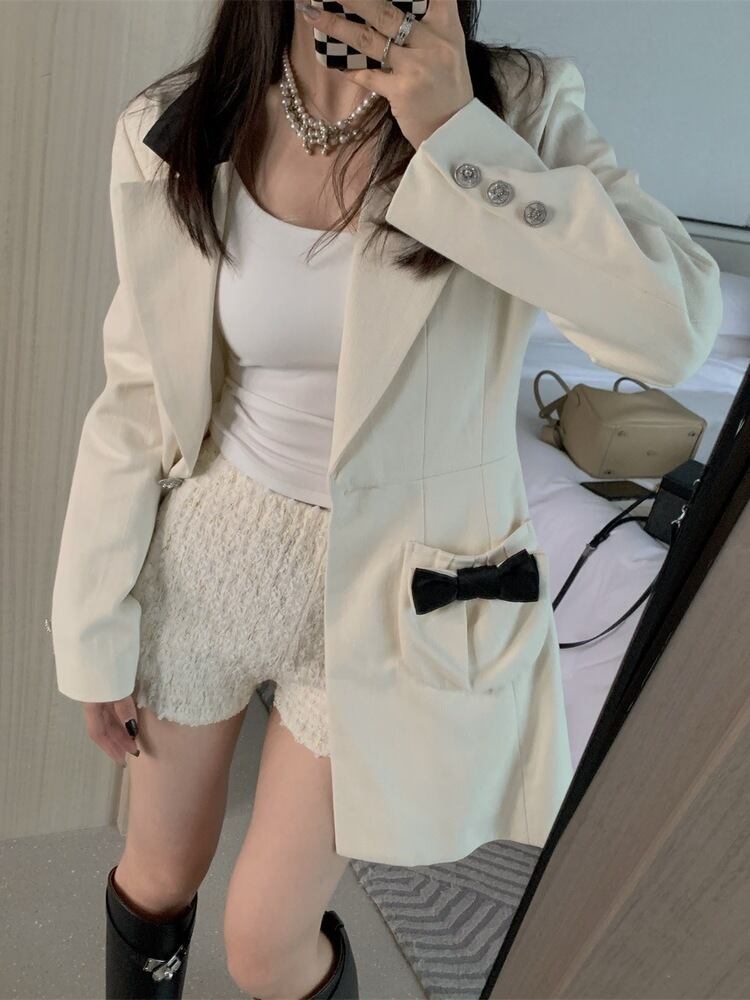 [EWQ] 蝶ネクタイ ポケット ブレザー コート シングル ボタン ノッチ スーツ ジャケット春秋ルース スーツ Y7333 リボン スプリング 春物 オータム 秋物