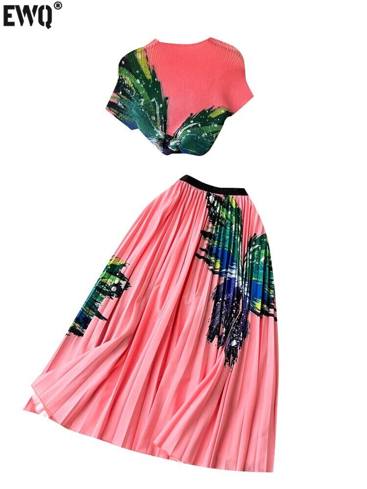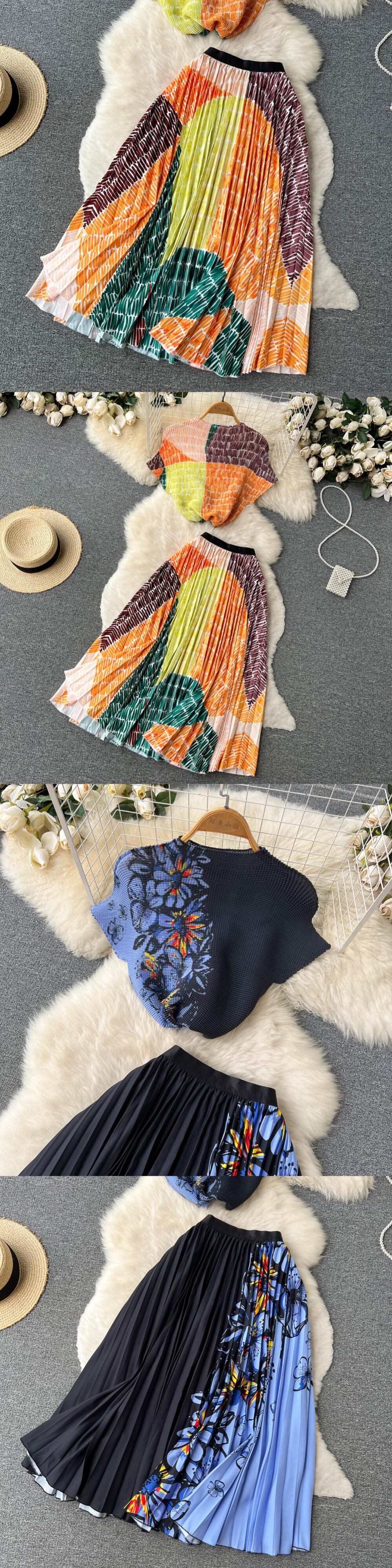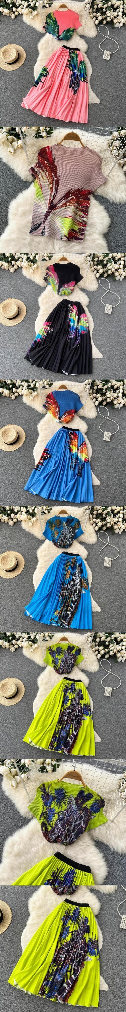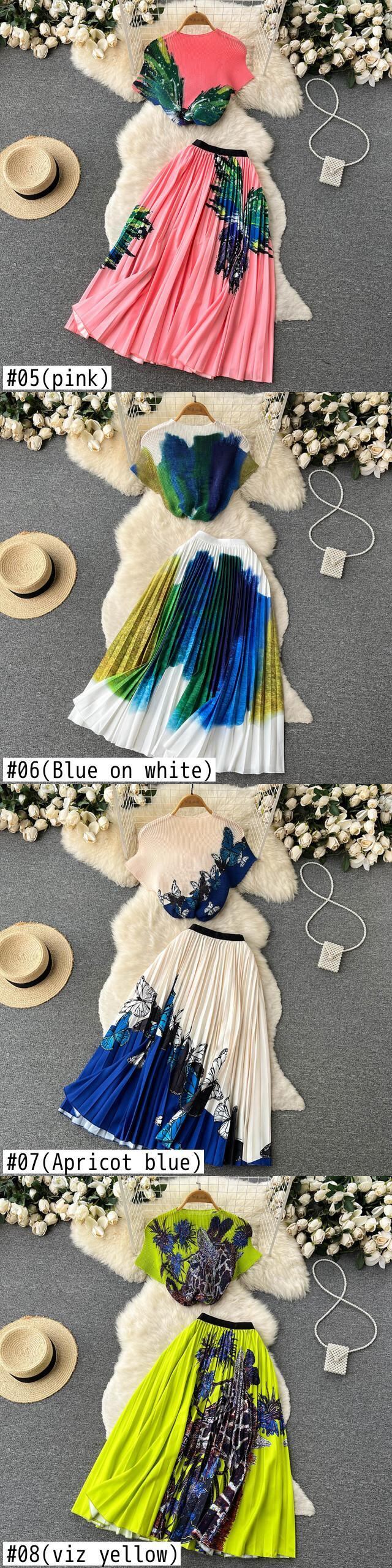 [EWQ] プリントショート Tシャツトップツーピーススーツ春グラデーションスーツウエストプリーツスカート 15 色スーツ Y356 スプリング 春物