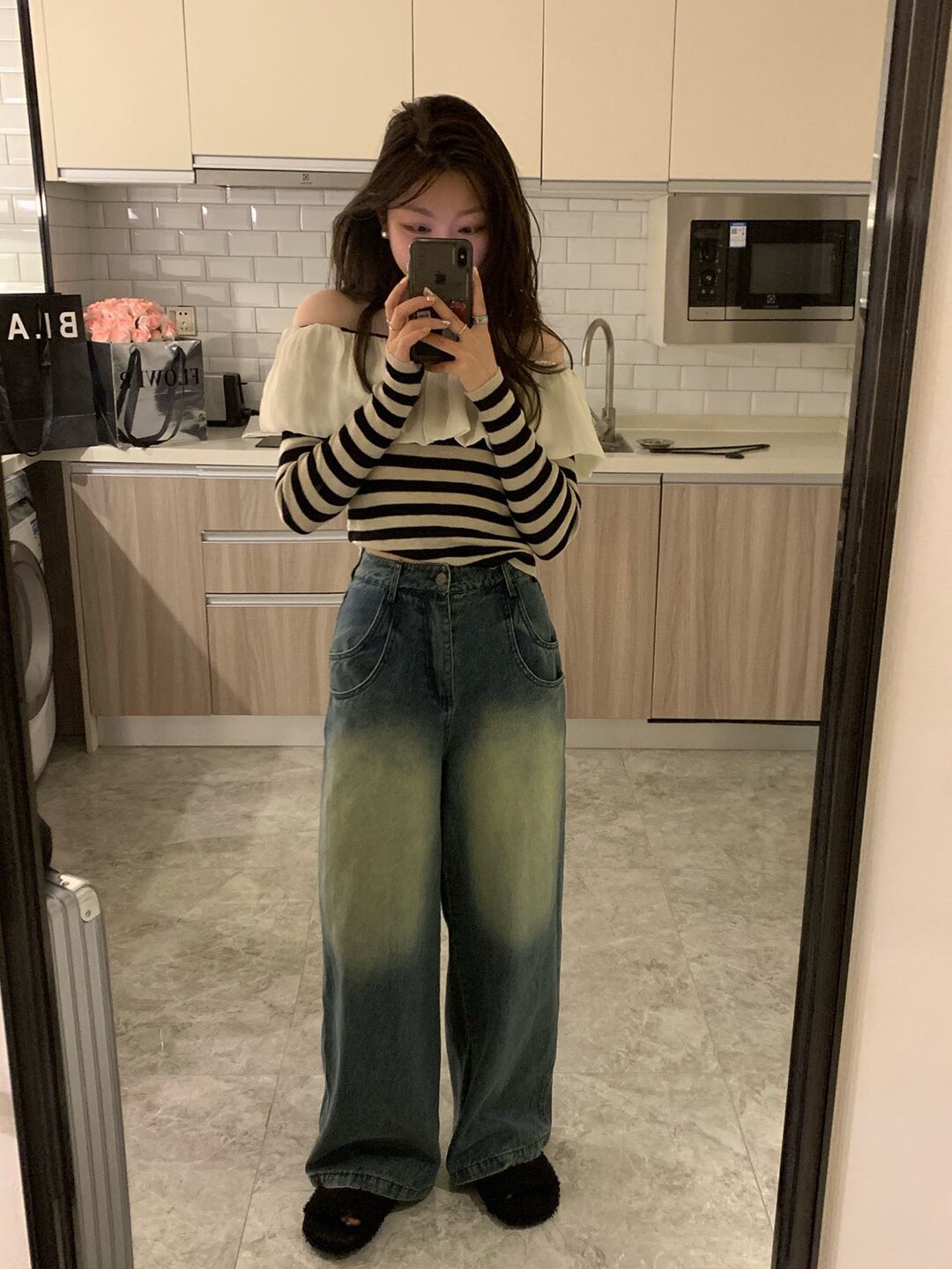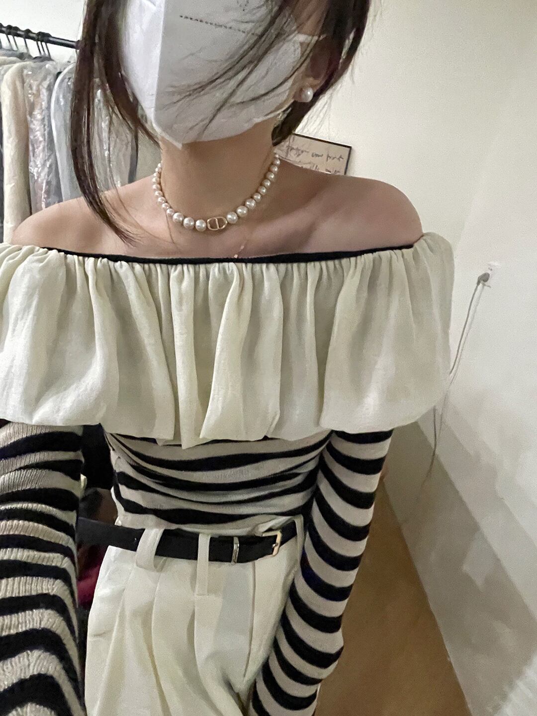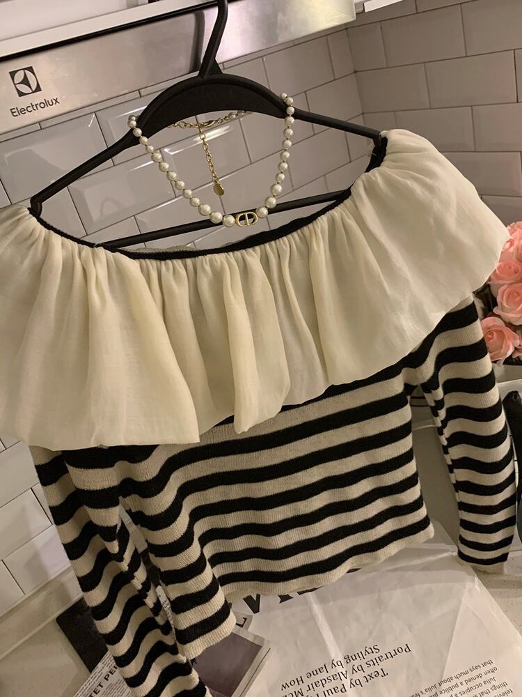 [EWQ] スラッシュネック ストライプ コントラストカラー ニット Tシャツ レディース 長袖 フリル つぎ ニット Tシャツ トップス 春 秋 ロング スプリング 春物 オータム 秋物