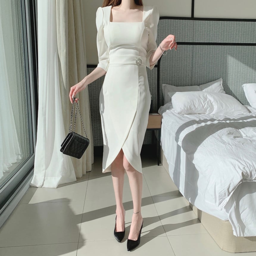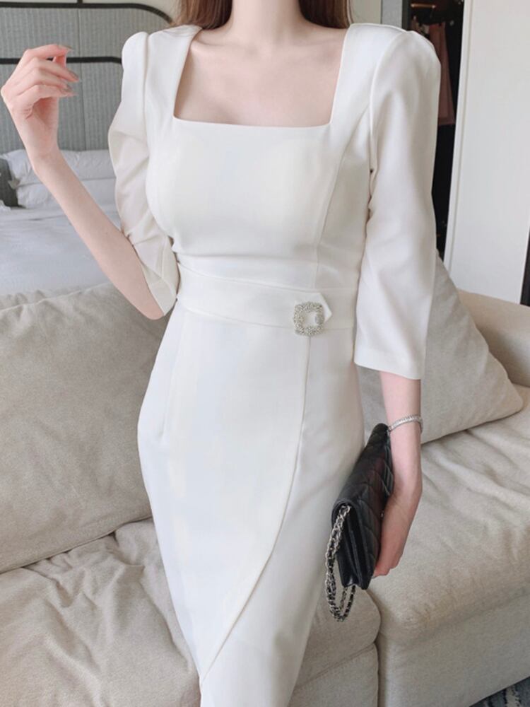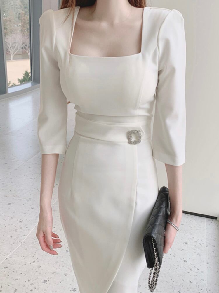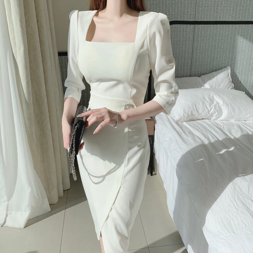 [EWQ] シックスクエアネックドレス不規則レースアップ無地 Vestido ドレス春夏パーティー乗った 6Y6215 スプリング 春物 サマー 夏物 ソリッドカラー スクウェア
