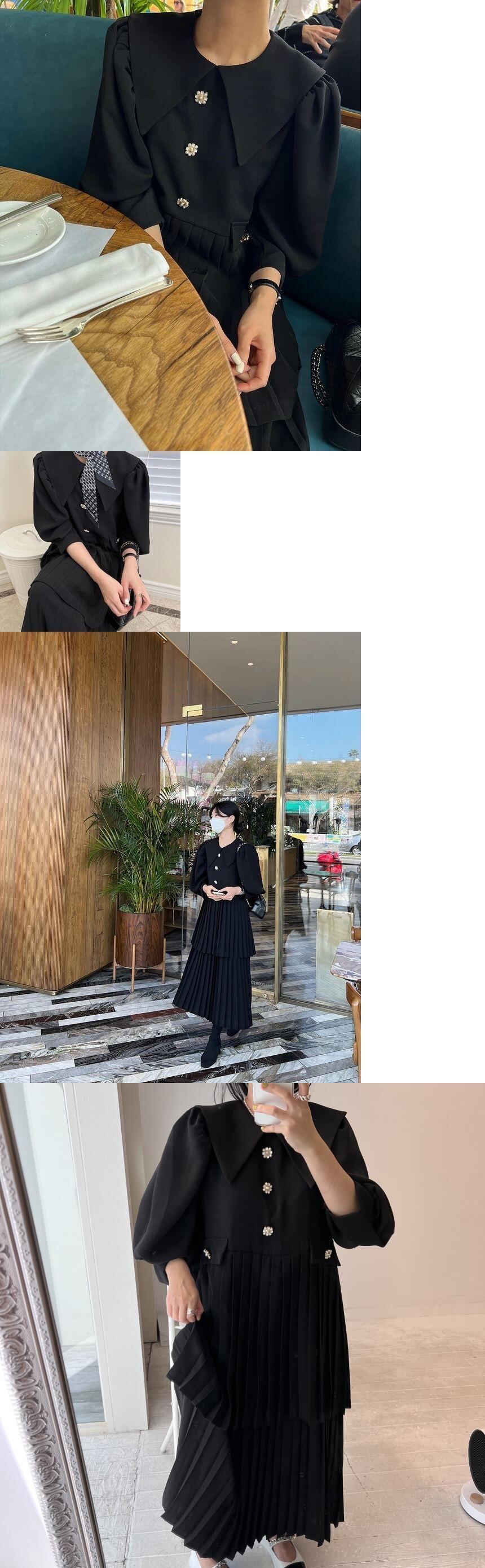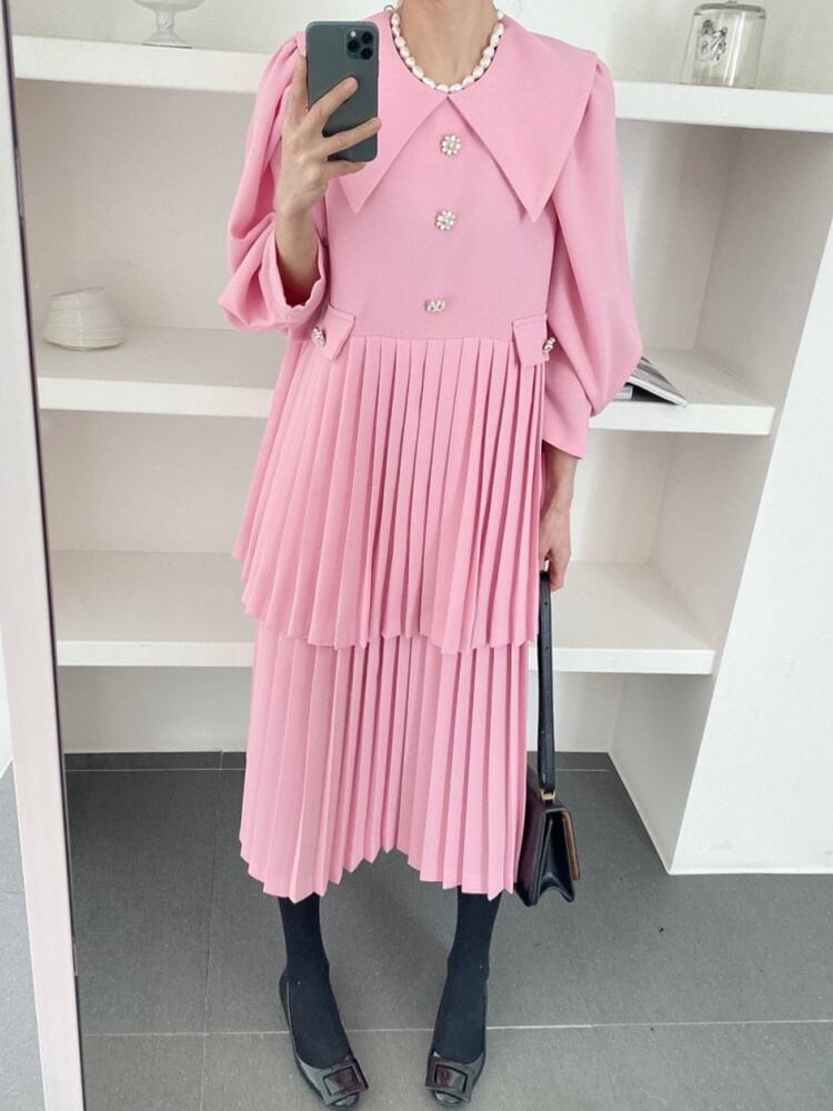 [EWQ] 秋ラペル花ボタン装飾ドレスピンクローブパフスリーブ二重層プリーツドレス オータム 秋物 フラワーデザイン
