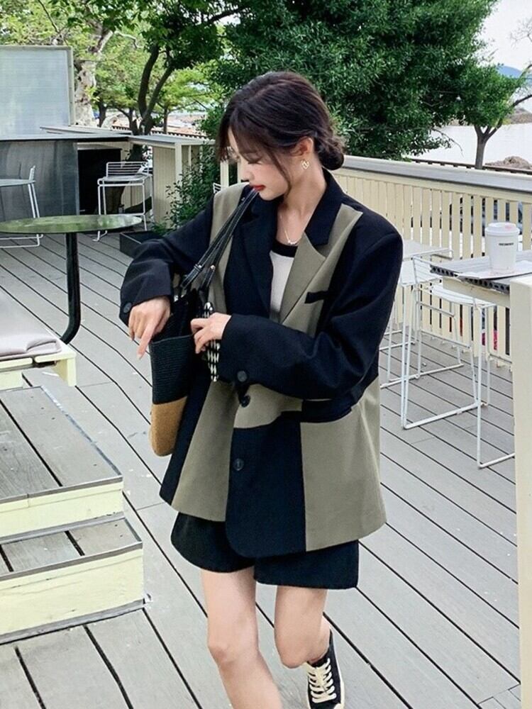 [EWQ] オフィスレディ ノッチドカラー パッチワーク コントラストカラー レディース ブレザー コート 春物 シングルブレスト ルーズスーツ スプリング 会社 学校 通勤や通学にも