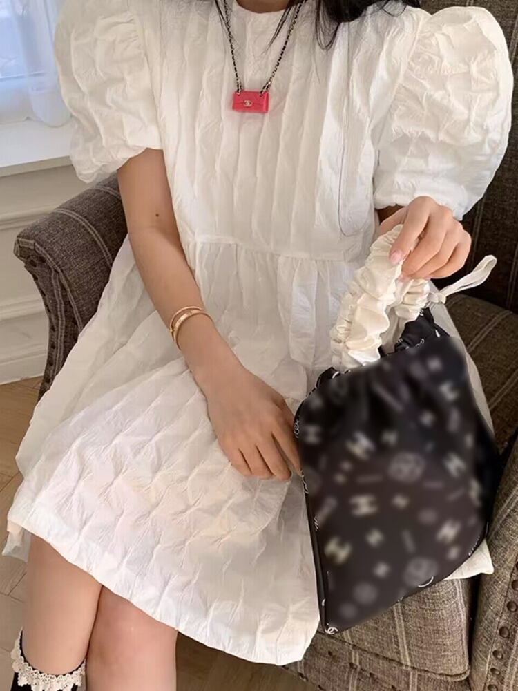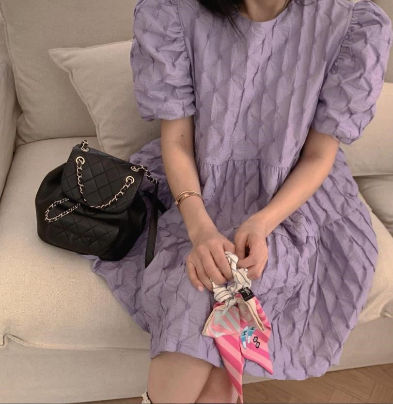 [EWQ] O ネック 3D バブルチェック柄ドレス紫パフスリーブルーズミニドレス夏 Vestido Y7538 サマー 夏物 Oネック パープル