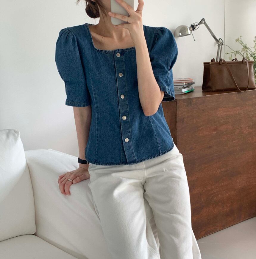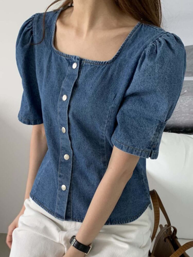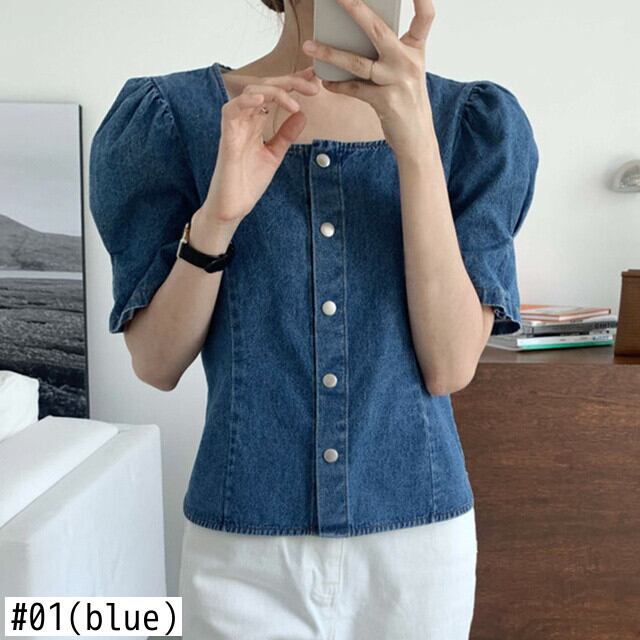 【EWQ】ブルー シングルブレスト デニムシャツ レディース 半袖 スクエアネック トップス サマーブラウス 7636 ショート ハーフスリーブ 夏物 スクウェア