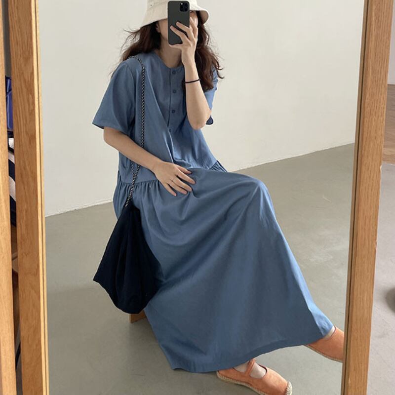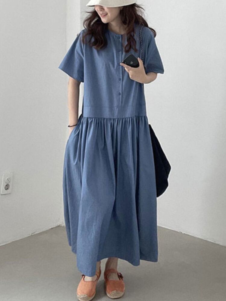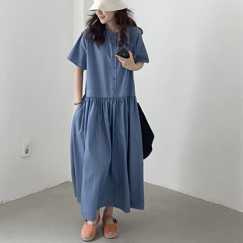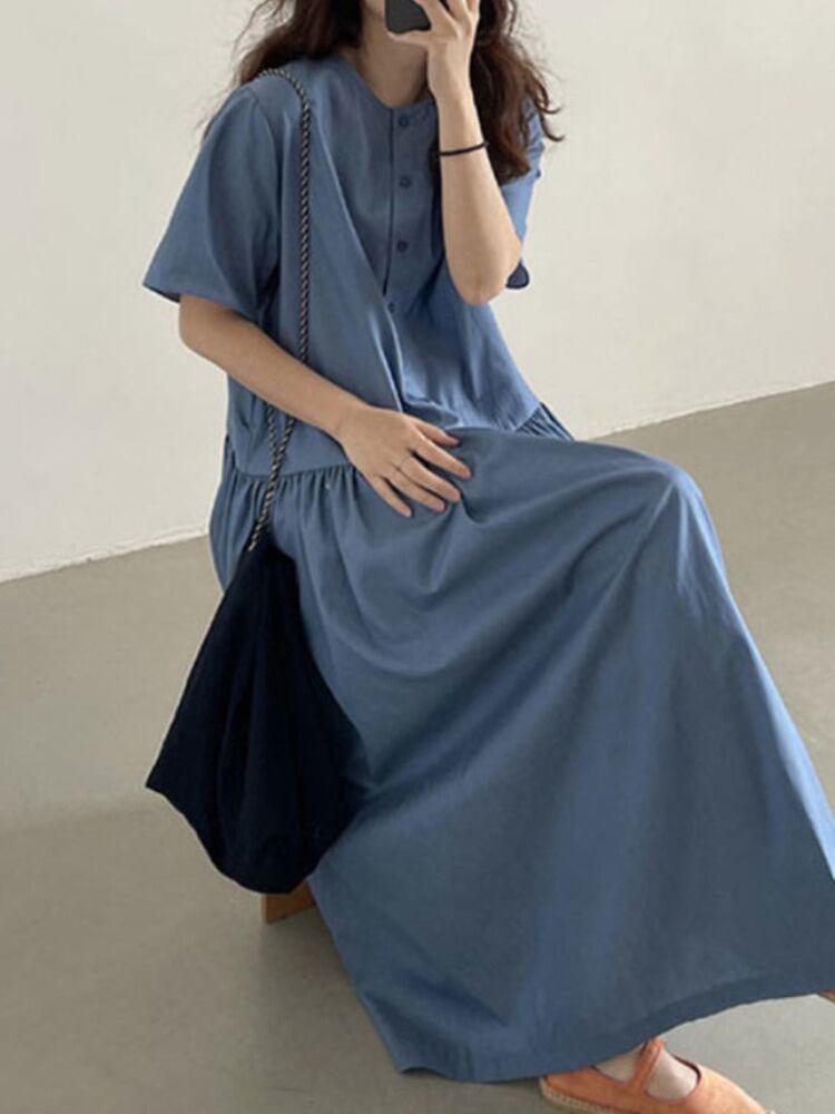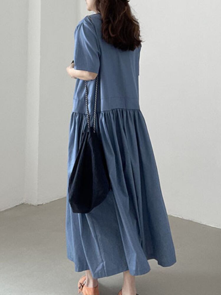 [EWQ] O ネック デニム ドレス半袖プリーツ スプライス ボタン ドレス春夏ルース Vestido ショート ハーフスリーブ スプリング 春物 サマー 夏物 Oネック