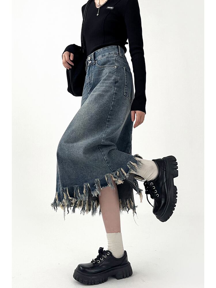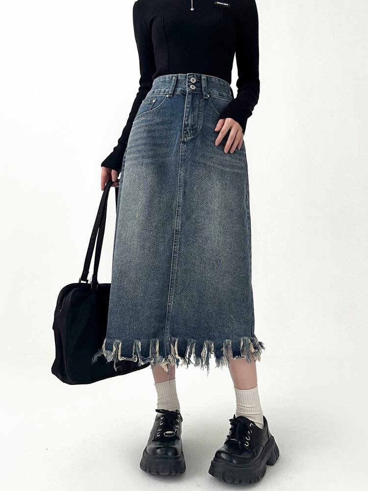 [EWQ] レディース テル デニム Aライン スカート ウエスト スプリット ミッドカーフ スカート 春 夏 ポケット ファルダス スプリング 春物 サマー 夏物