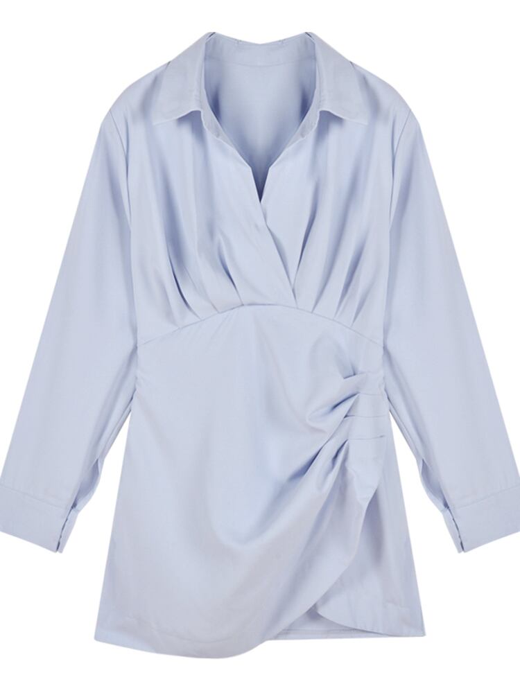 [EWQ] セクシー V ネックブルーシャツドレスウエストプリーツ長袖 Vestido 春秋シックパーティードレス 6Y6181 ロング スプリング 春物 オータム 秋物 Vネック