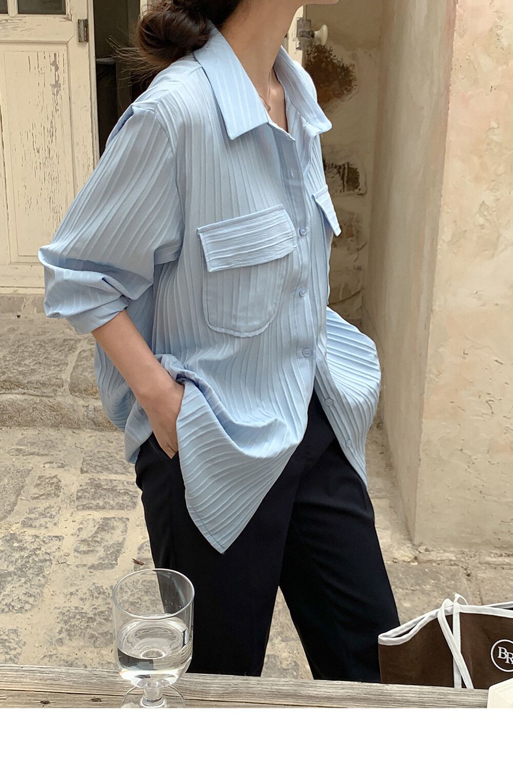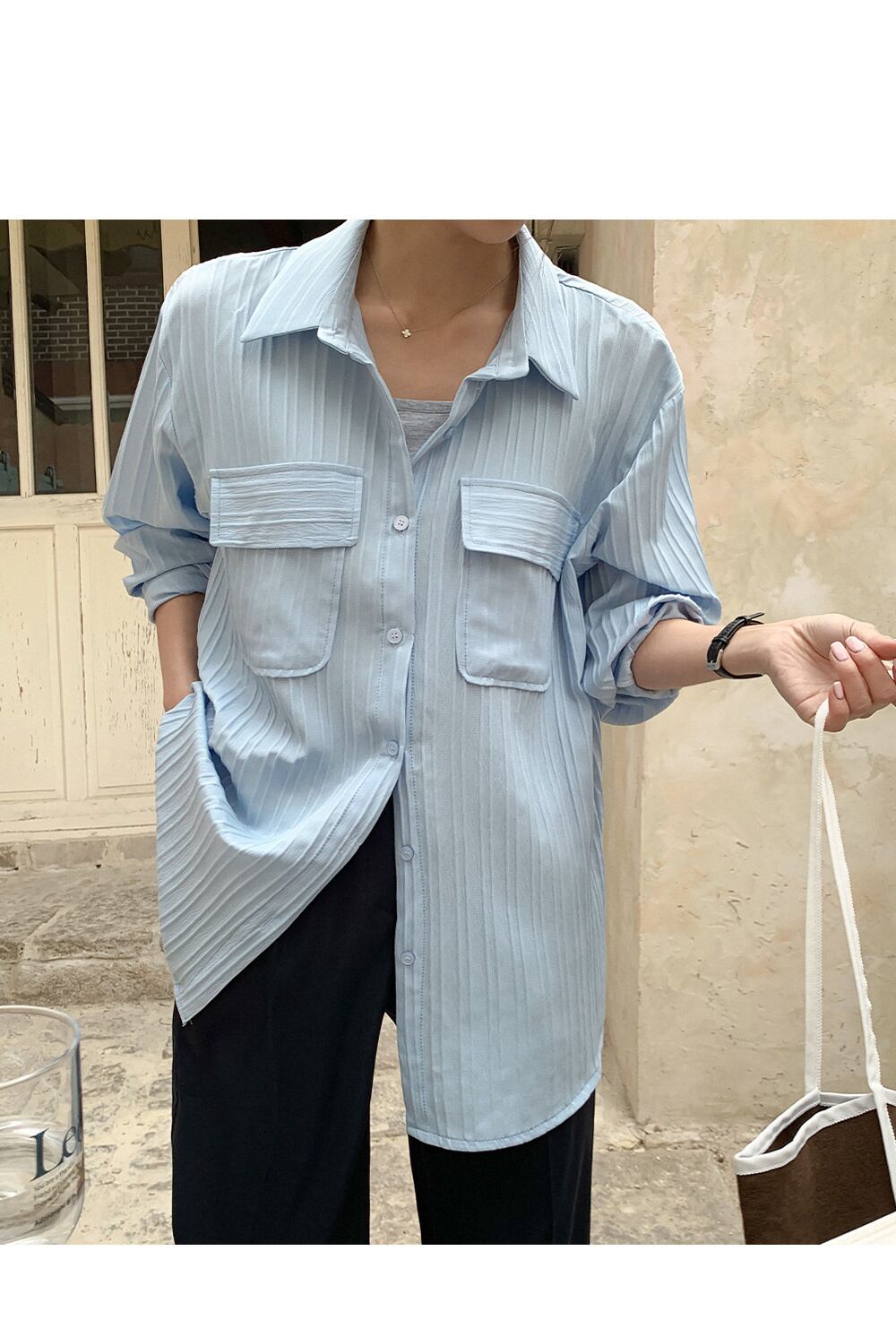 [EWQ] ブルーラペルフォールドポケットシャツシングルブレストルーズ因果長袖ブラウス春秋潮トップ 6Y7764 ロング スプリング 春物 オータム 秋物