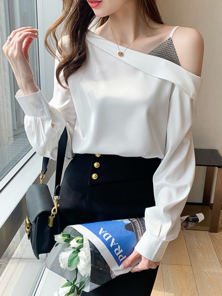 [EWQ] セクシーオフショルダー長袖シャツ春秋潮スプライシングブラウス美しいトップス 16Y60 ロング スプリング 春物 オータム 秋物