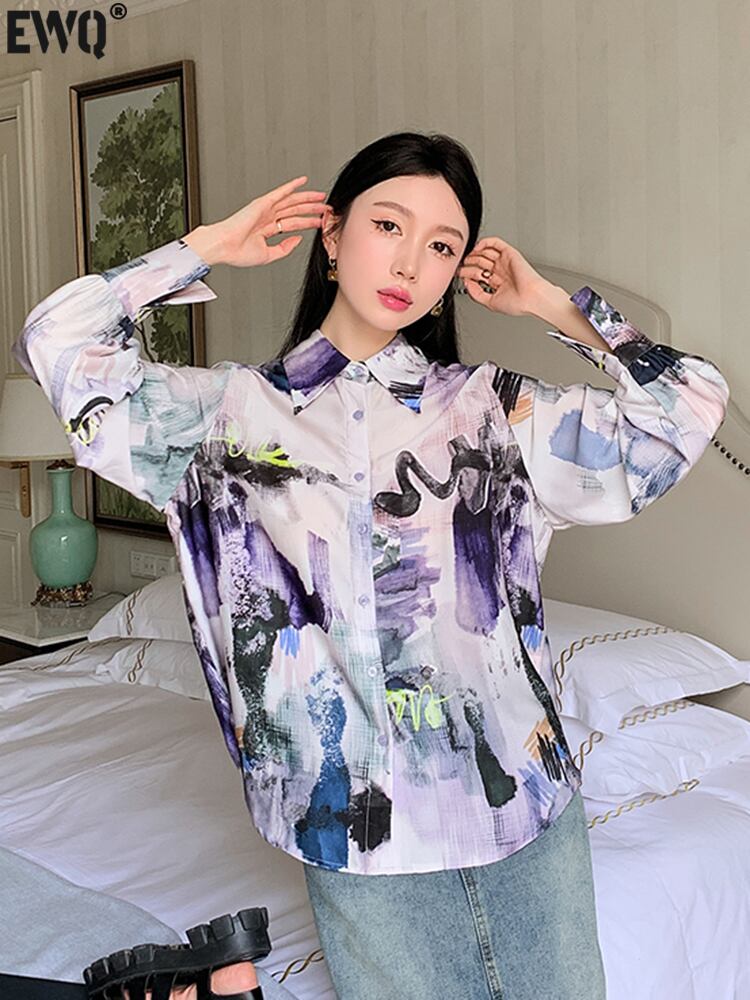 【EWQ】ランタンスリーブプリントシャツ レディース コントラストカラー シングルブレスト ブラウス トップス 春夏 レター スプリング 春物 サマー 夏物
