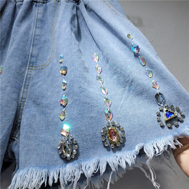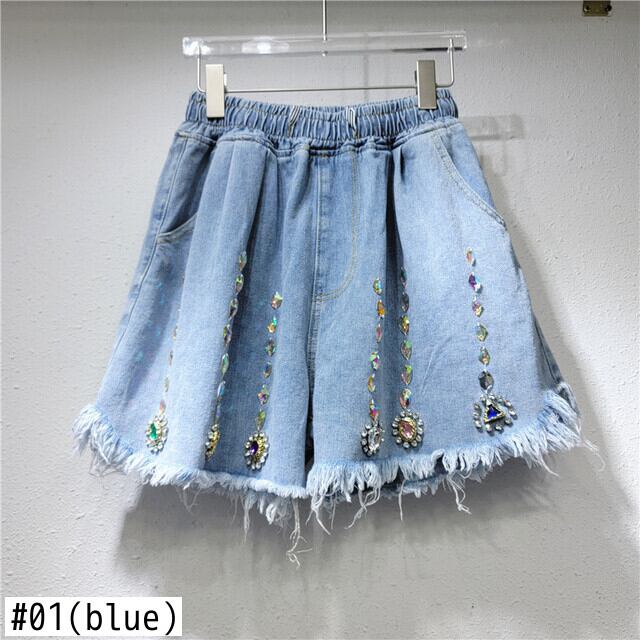 [EWQ] ビーズ ダイヤモンド デニム ショート パンツテル ルーズ ワイド脚弾性ウエスト夏タイド ポケット ショート ジーンズ 16Y8340 エラスティック 伸縮 サマー 夏物 ショーツ ブルマー ワイドレッグ ワイドパンツ