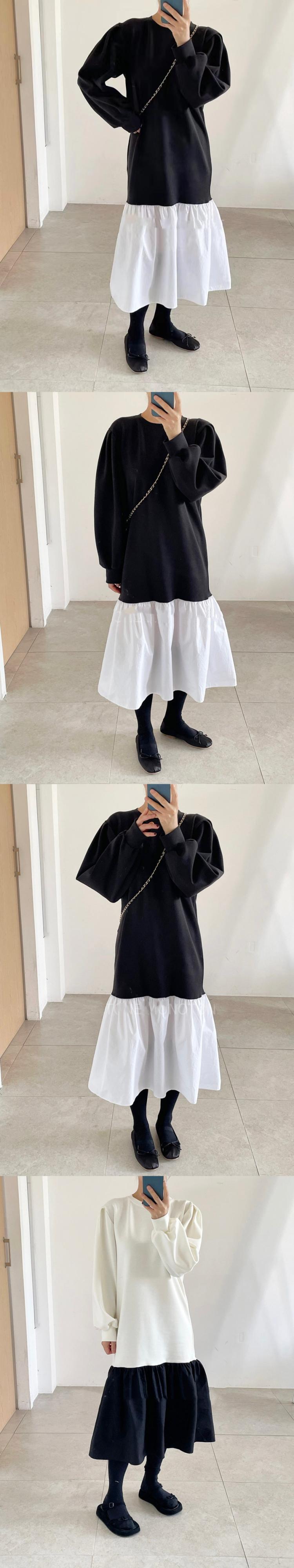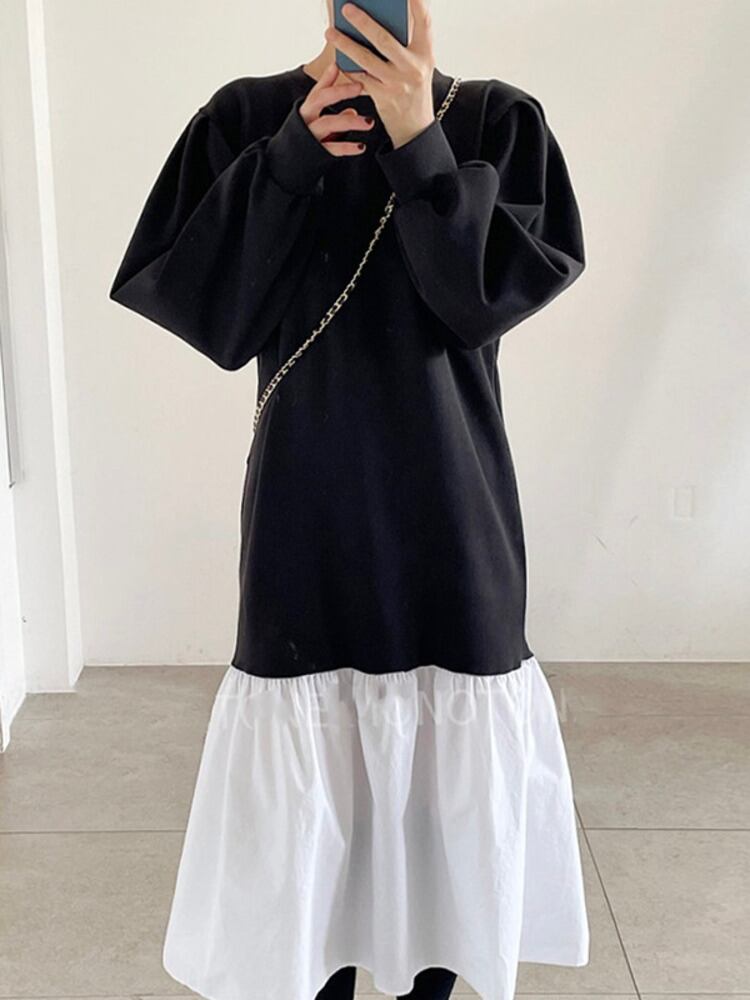 【EWQ】ゆったりOネック コントラストカラー 長袖 フリル ゆったり ロング スウェットワンピース 春 冬 Y3668 スプリング 春物 ウィンター 冬物