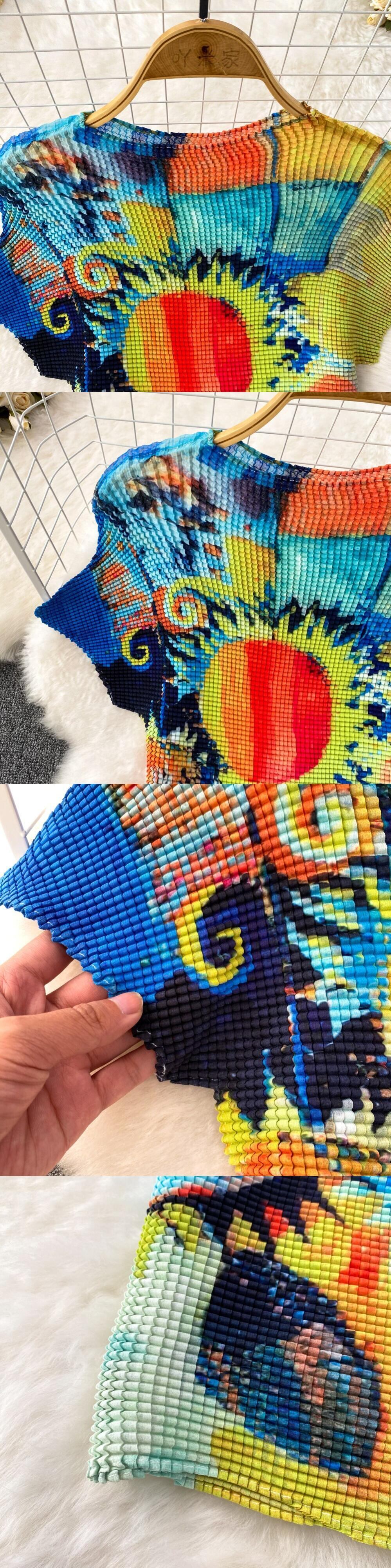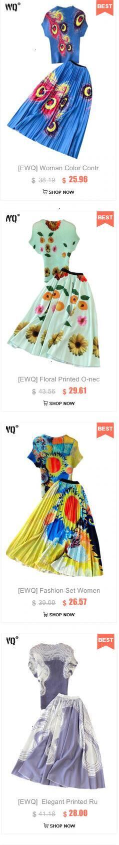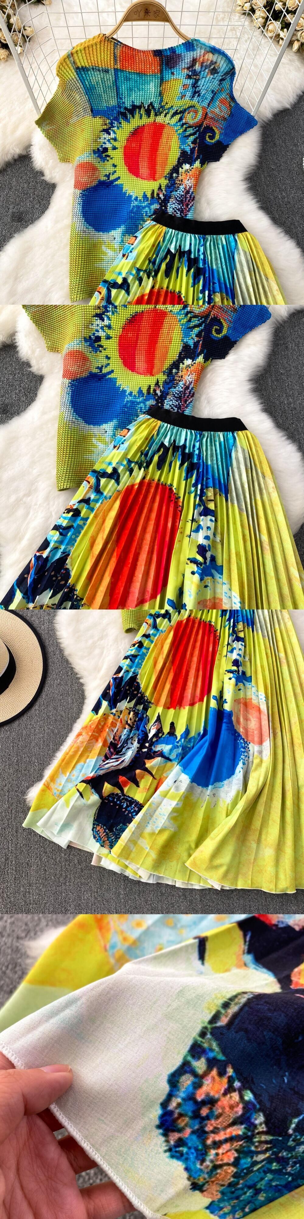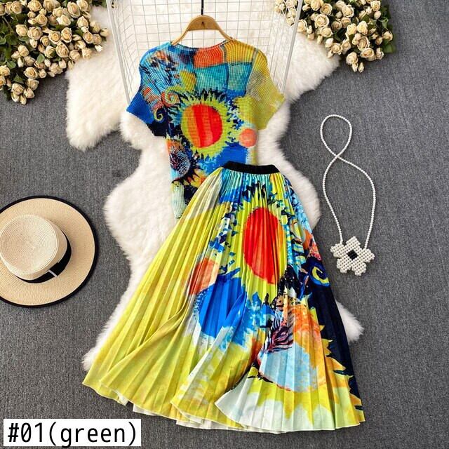 【EWQ】セットレディース半袖プリーツトップ+ウエストプリントAラインスカートサマータイドプリントコントラストスーツ026 ショート ハーフスリーブ 夏物