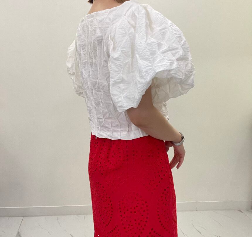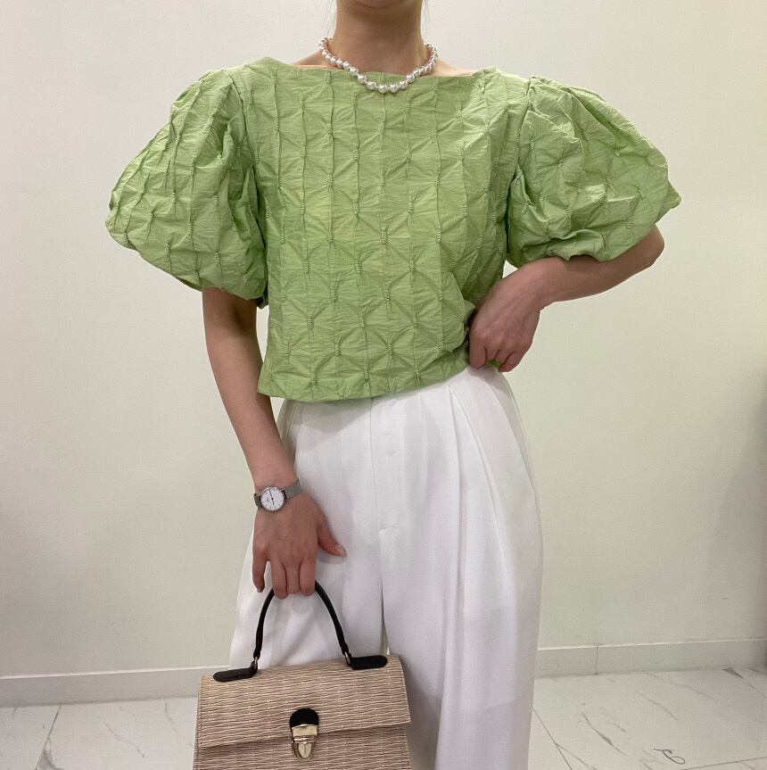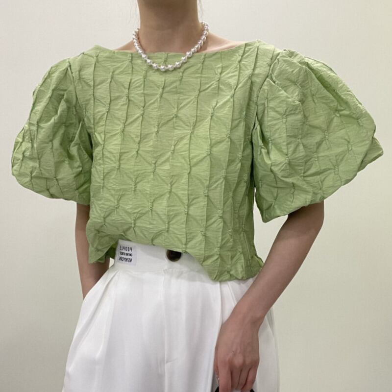 [EWQ] スラッシュネック無地チェックシャツパフスリーブルーズカジュアルブラウストップ夏潮トップス 1579 レッド サマー 夏物 ソリッドカラー
