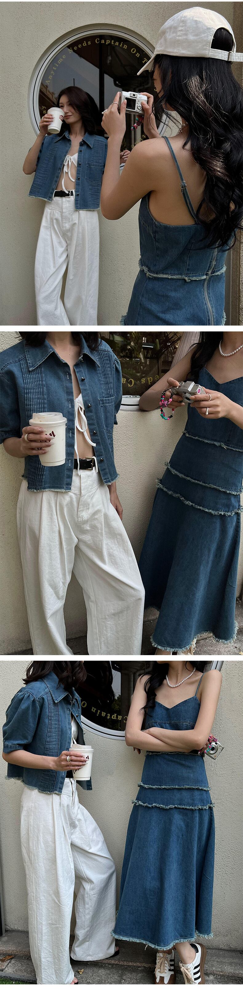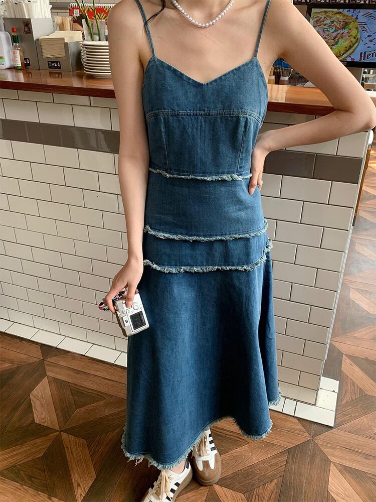 [EWQ] 電話デニム スリング ドレス無地パッチワーク ノースリーブ スリム フィット ドレス夏潮 Vestidos 510 サマー 夏物 ソリッドカラー