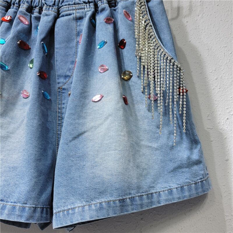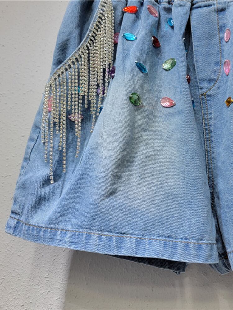 [EWQ] Tel ビーズ カラフルデニム ショーツ弾性ウエスト ポケット ストリート夏潮ショート ワイド脚ジーンズ エラスティック 伸縮 サマー 夏物 ブルマー ワイドレッグ ワイドパンツ