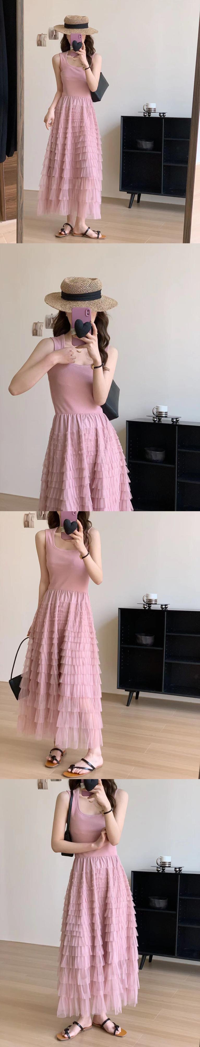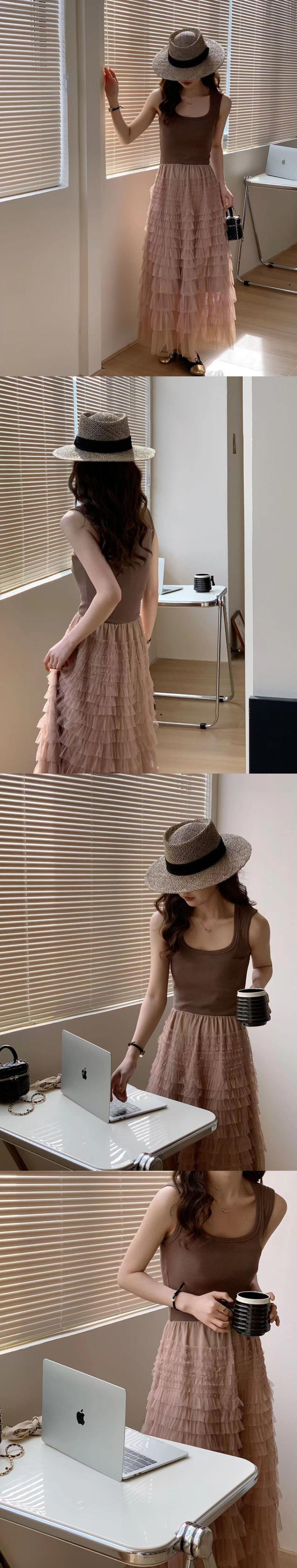 [EWQ] ティアードフリルスプライスタンクトップドレスパッチワークメッシュコントラストノースリーブスリムドレスサマータイド Vestido レッド 夏物