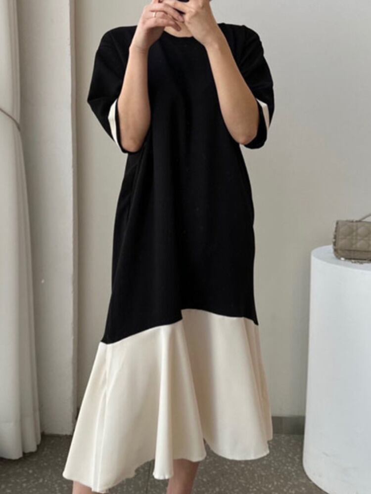 [EWQ] フリルスプライスコントラストカラードレス半袖ルーズ因果 O ネックドレスサマー Vestido 16Y8505 ショート ハーフスリーブ 夏物 Oネック