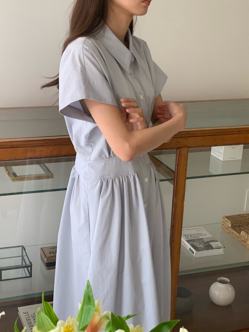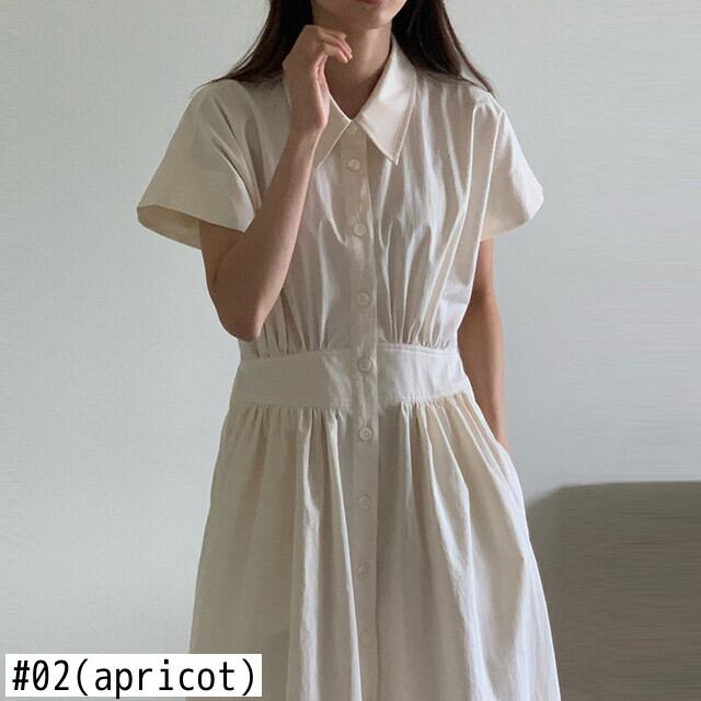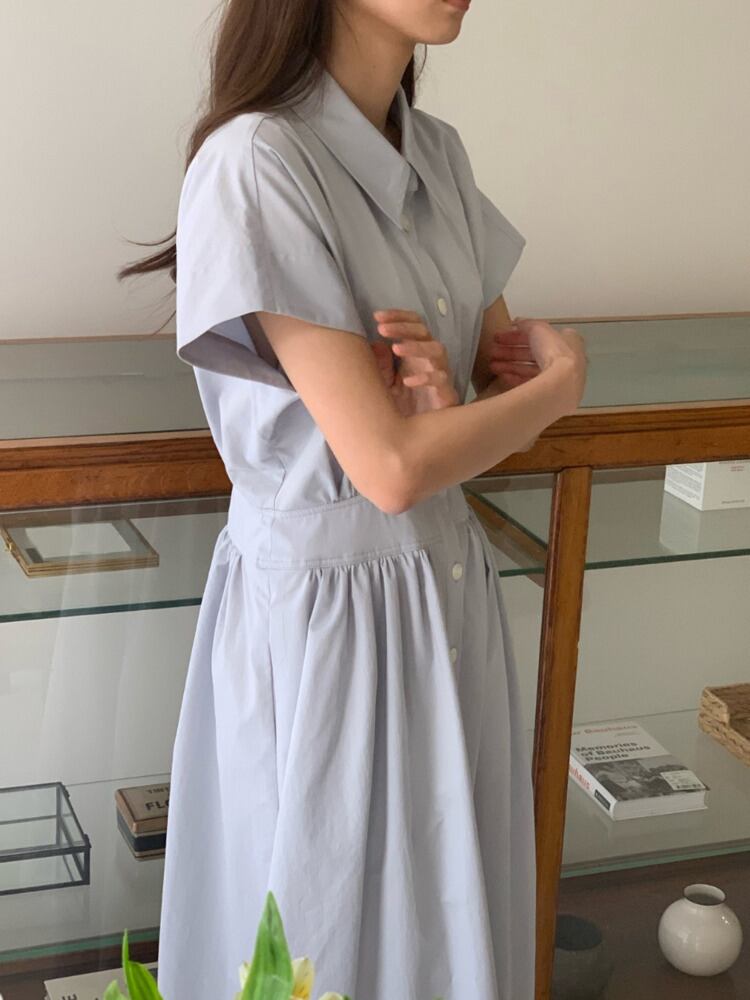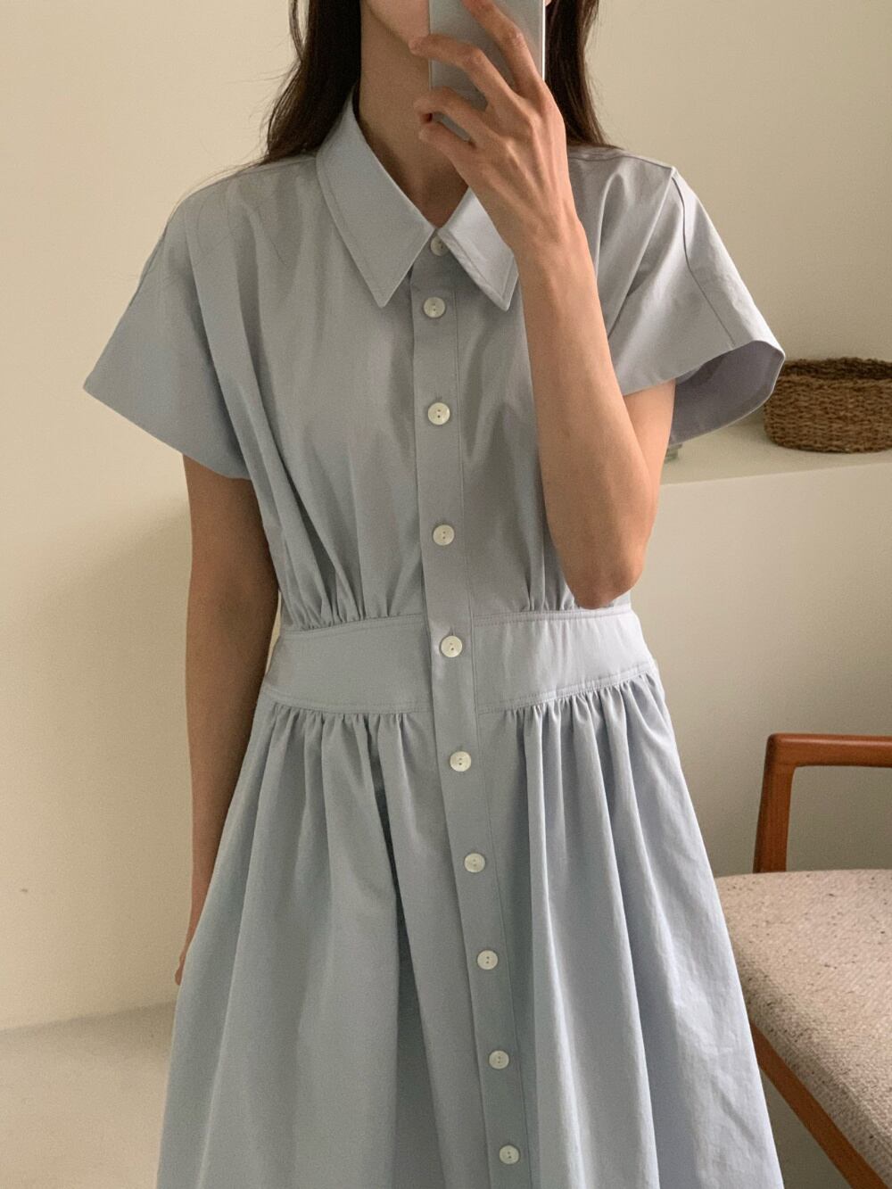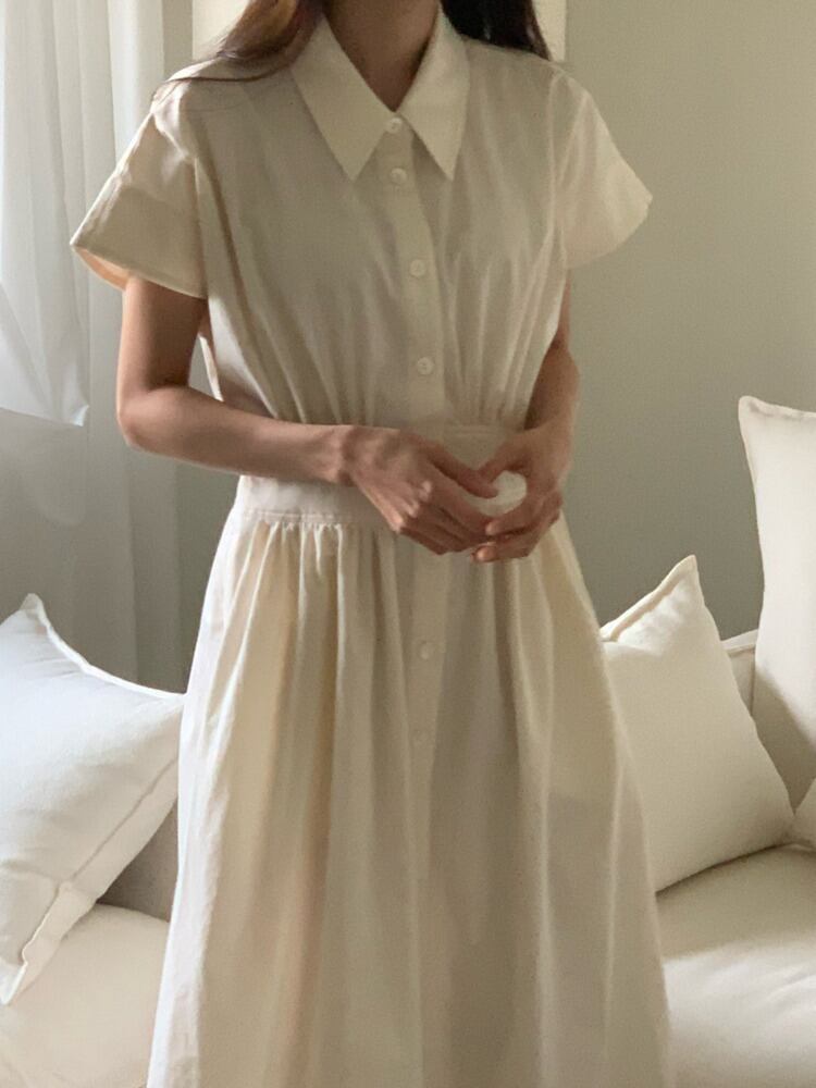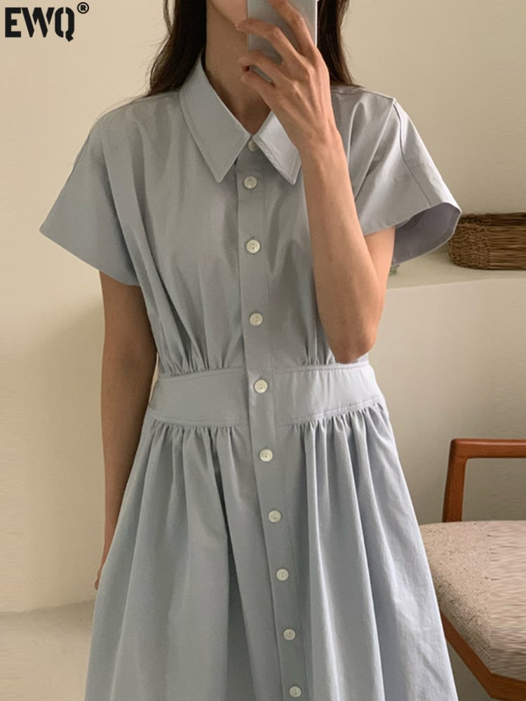 [EWQ] シンプルシングルブレストシャツドレスラペル無地プリーツウエスト半袖ドレス夏潮 Vestido ショート ハーフスリーブ サマー 夏物 ソリッドカラー
