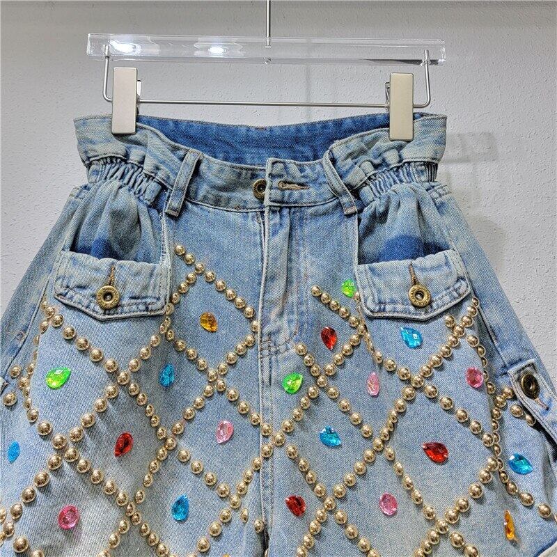 [EWQ] ダイヤモンド ビーズ スパンコール デニム ショーツポケット ウエスト ストリート コントラスト カラー夏潮ショーツ ジーンズ サマー 夏物 ブルマー