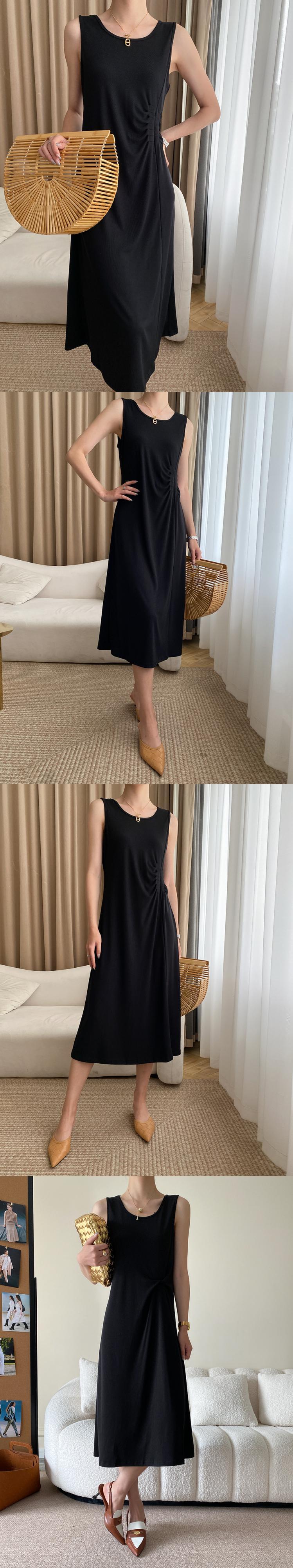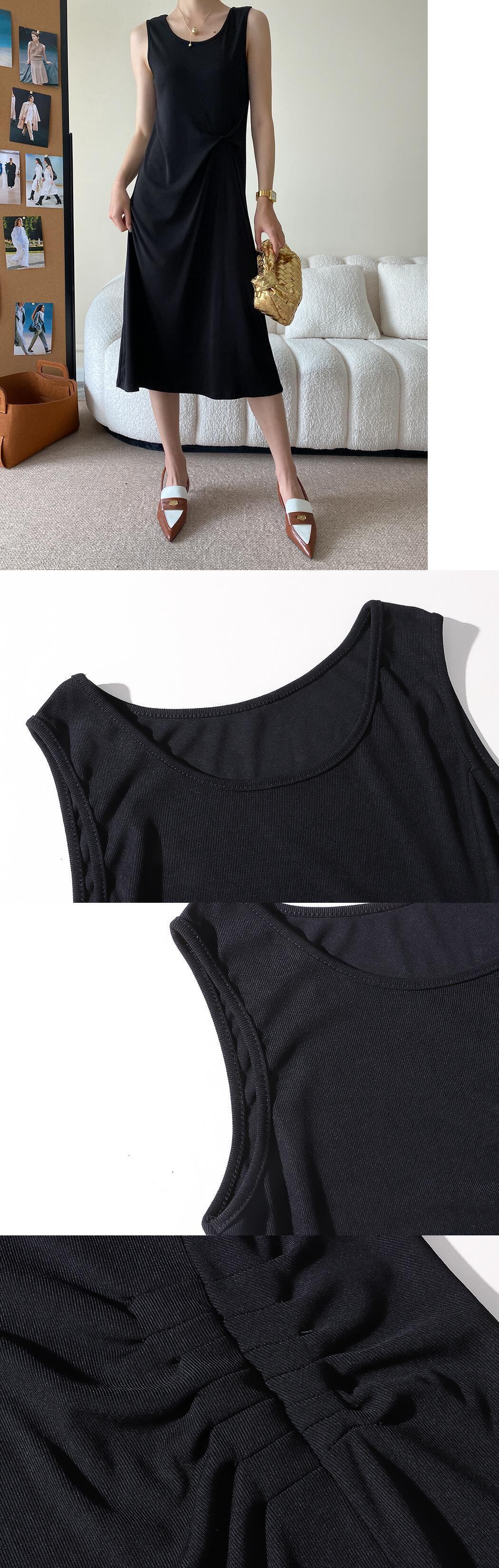 [EWQ] サイド プリーツ ベスト ドレス無地ノースリーブ スリム フィット ロング ドレス夏潮 Vestidos 16Y8512 サマー 夏物 ソリッドカラー