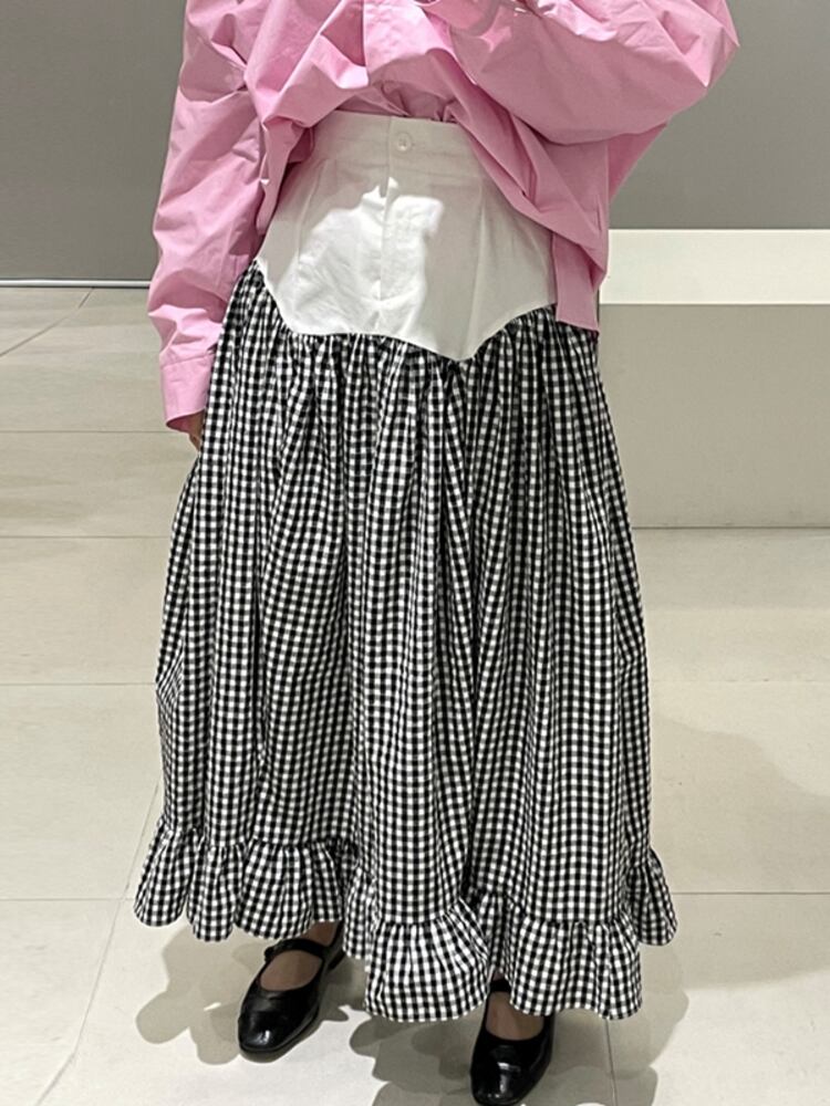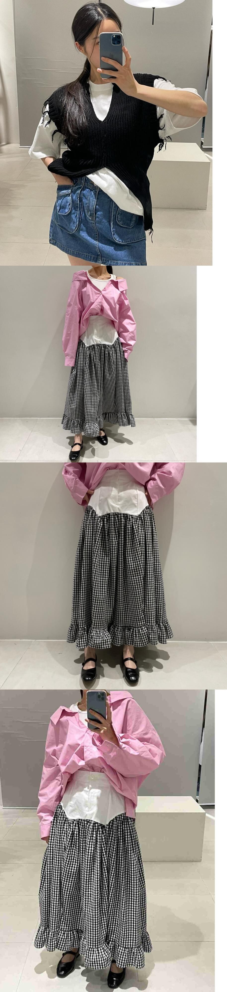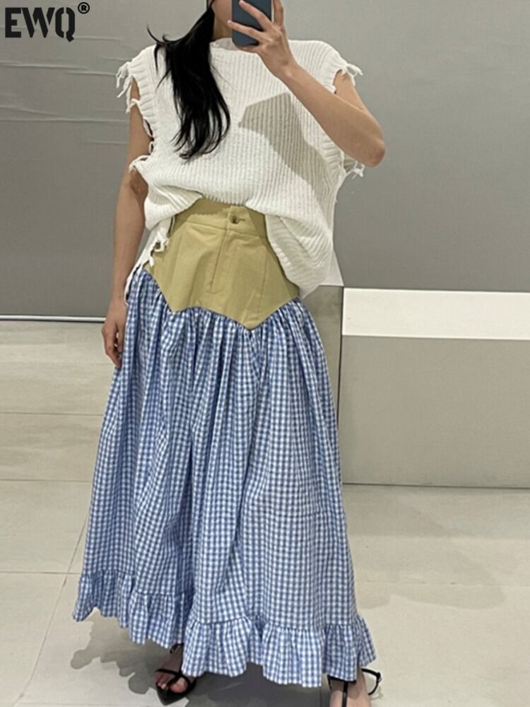 [EWQ] テルニットベストトップ + コントラストチェック柄ウエストミッドカーフスカートサマータイドツーピーススーツ 16Y8501 夏物