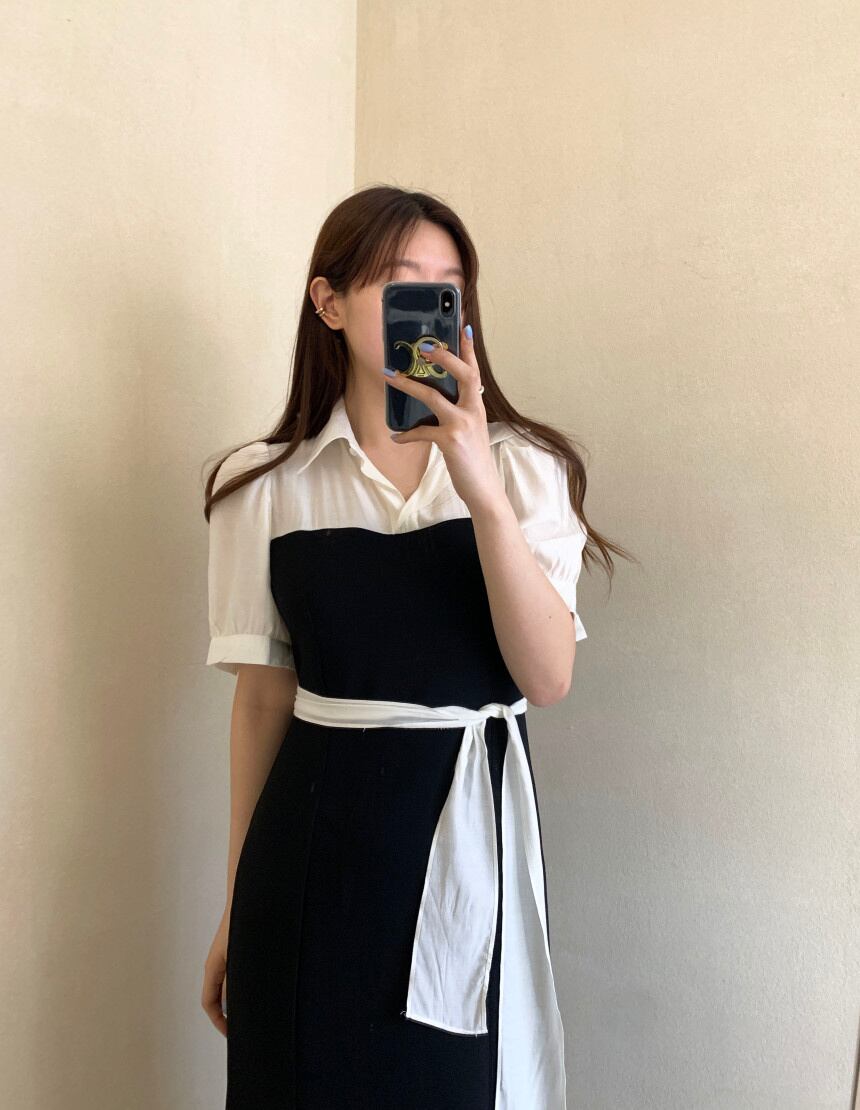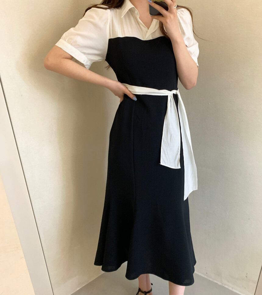 [EWQ] スプライス コントラスト フェイク ツー ピース ドレス ラペル レース アップ ウエスト スリム フィット ロング ドレス夏潮 Vestido サマー 夏物 レースアップ
