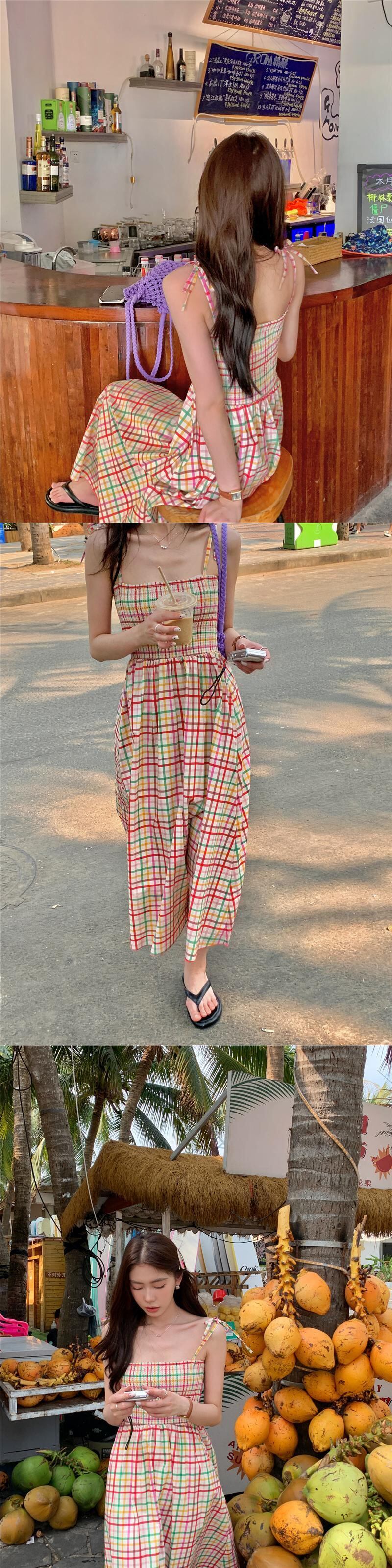 [EWQ] レディース オフショルダー スリング ドレス カラー コントラスト チェック プリーツ ウエスト ノースリーブ ドレス 夏 潮 Vestidos レッド サマー 夏物