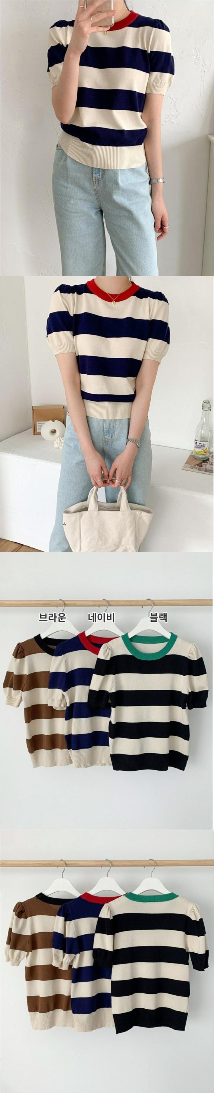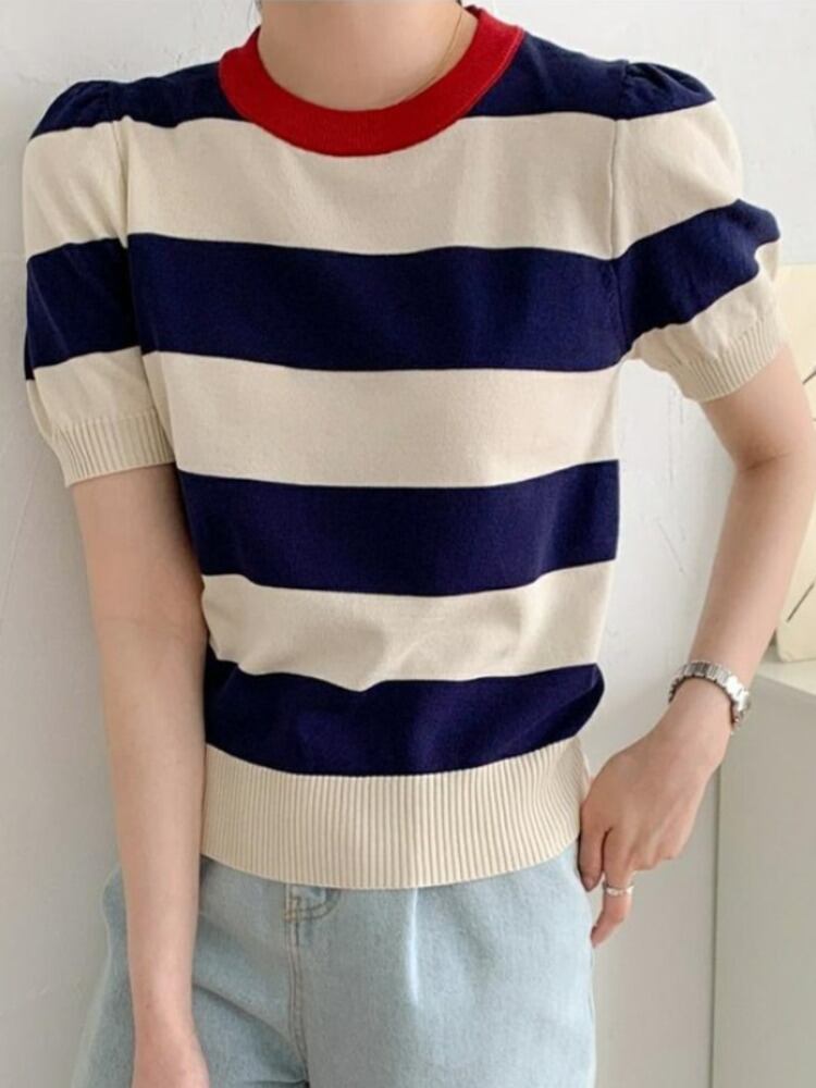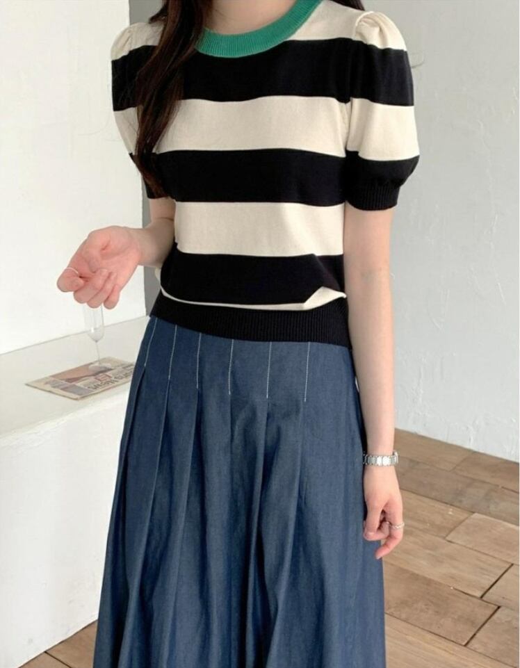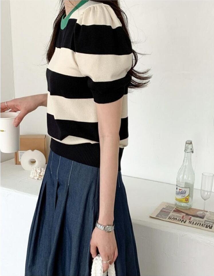 [EWQ] O ネック ストライプ ニット Tシャツ 半袖 弾性編み コントラスト Tシャツ トップス サマー タイド トップス 6Y8373 ショート ハーフスリーブ エラスティック 伸縮 夏物 Oネック