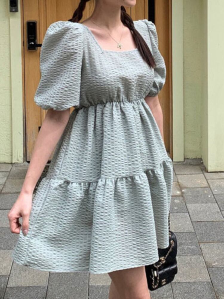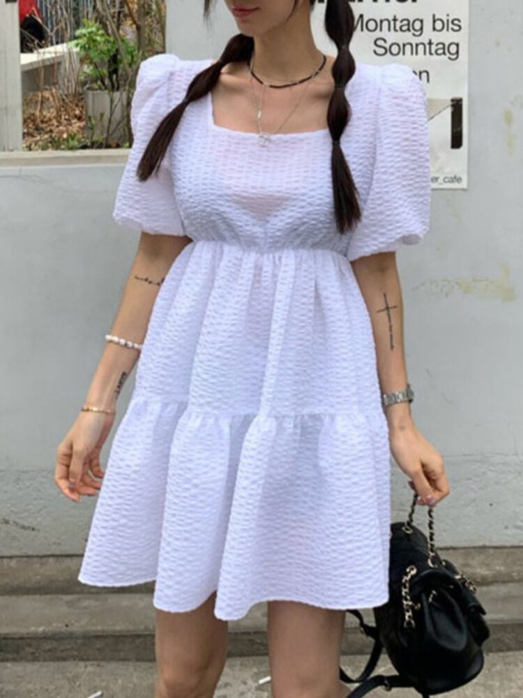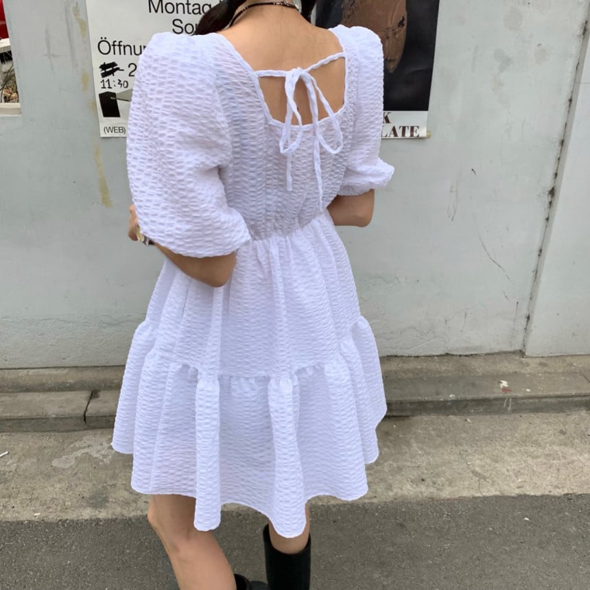 [EWQ] ジャカード バック レースアップ ドレス スクエア ネック フリル スプライシング無地ミニ ドレス夏潮 Vestido サマー 夏物 ソリッドカラー スクウェア