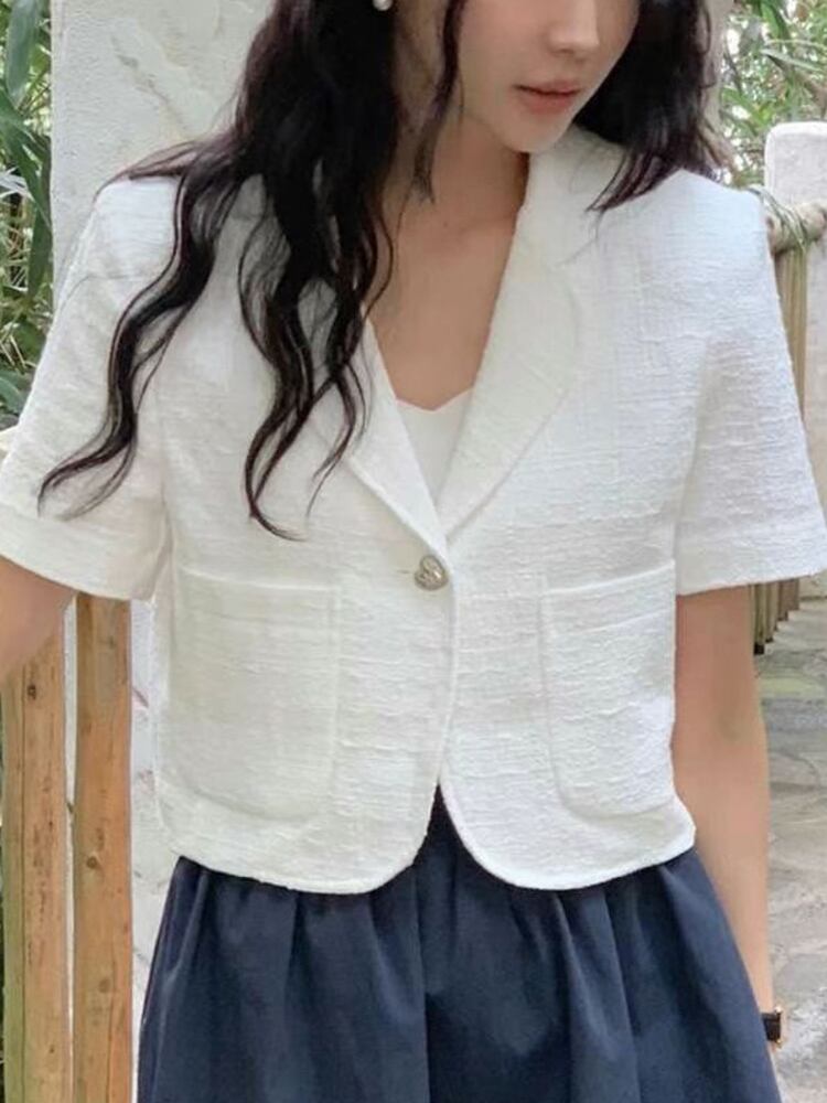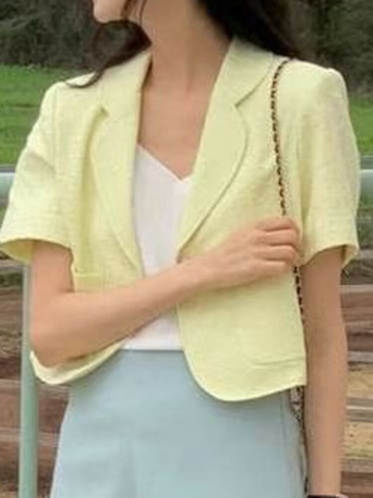 [EWQ] レディース ワンボタン ポケット 薄手コート 半袖 紫 ジャカード カジュアル ジャケット コート サマータイドトップ 6Y8492 ショート ハーフスリーブ 夏物 パープル