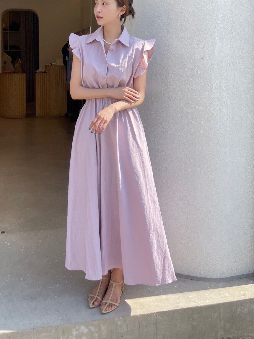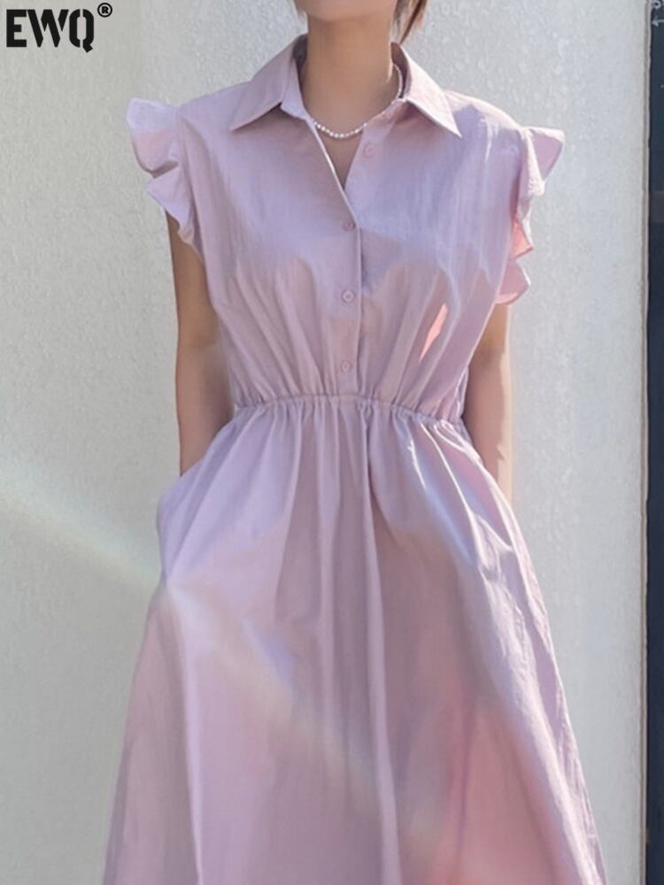 [EWQ] 甘いラペル プリーツ ウエスト ドレス無地フライング スリーブ ドレス夏 Vestido 503 大人ガーリー スウィート キュート カジュアル サマー 夏物 ソリッドカラー