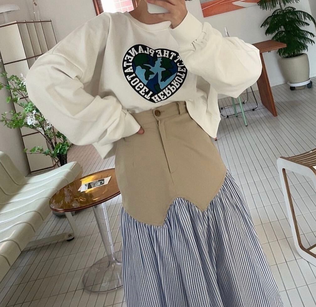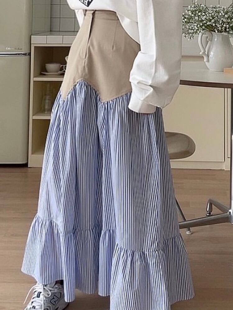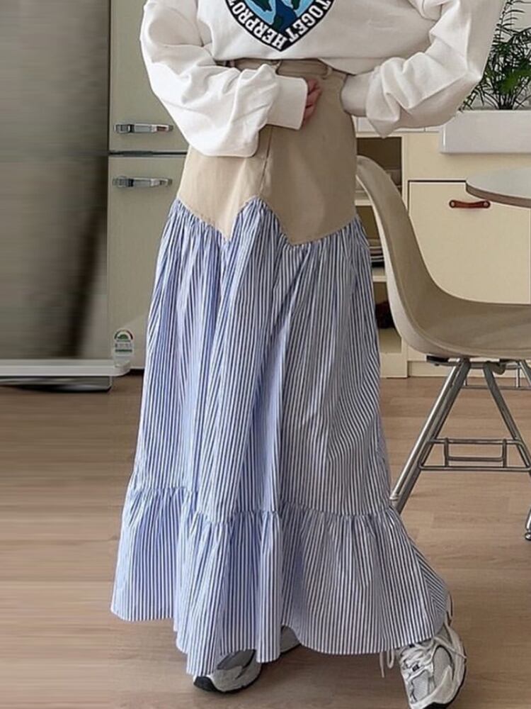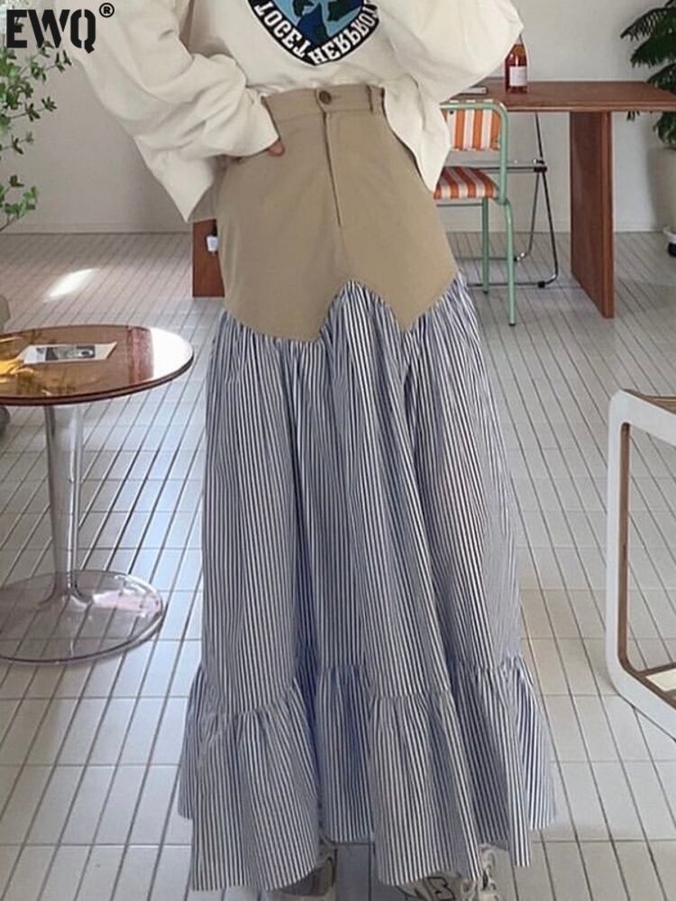 [EWQ] レディース コントラストカラー パッチワーク チェック柄スカート ワンボタンウエスト ミッドカーフスカート 夏潮 ファルダス サマー 夏物