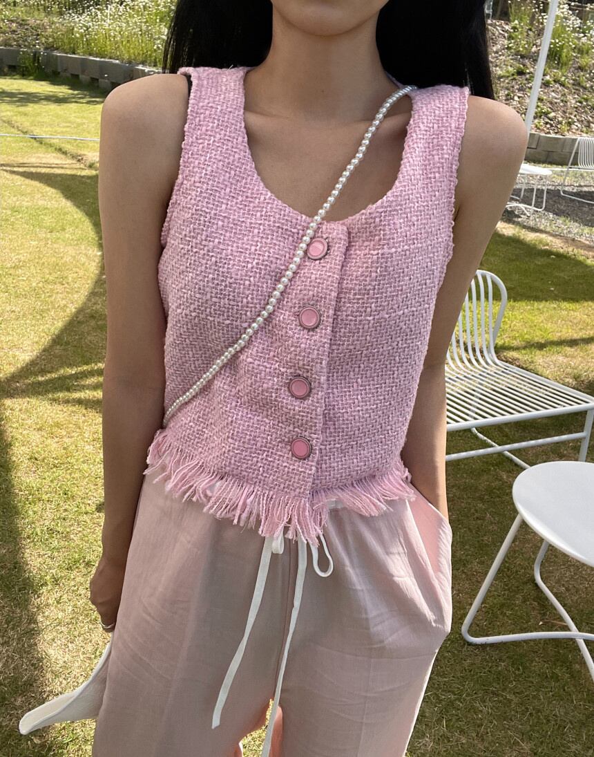 [EWQ] シングル ブレスト ツイード ベスト O ネック ノースリーブ ジャケット トップ夏タイド ピンク Tel トップス 16Y8412 サマー 夏物 Oネック