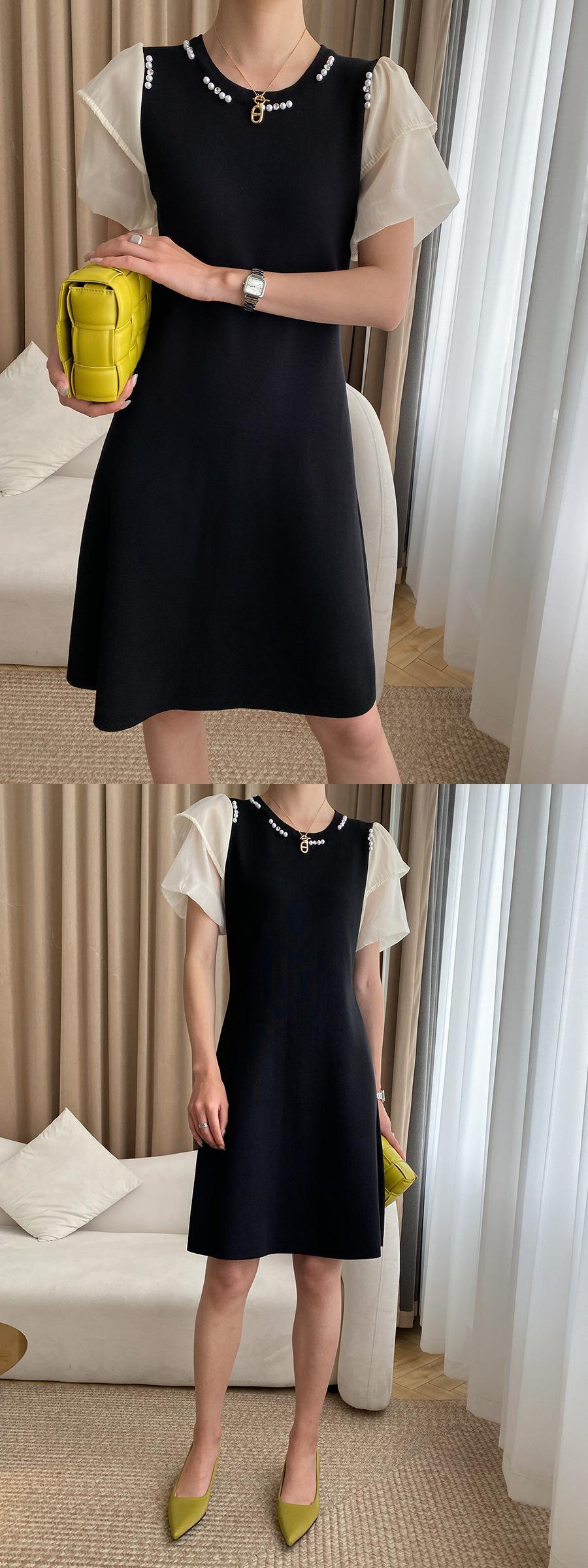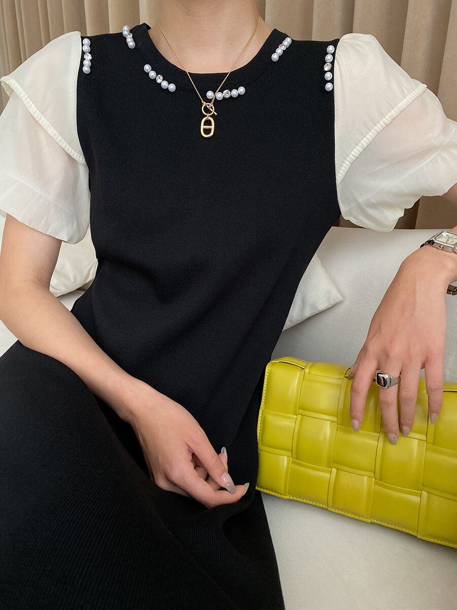 【EWQ】パールつぎ Oネック コントラストワンピース バブルスリーブ ワンピース 夏 キレイめ 婦人服 サマー 夏物 ドレス 真珠