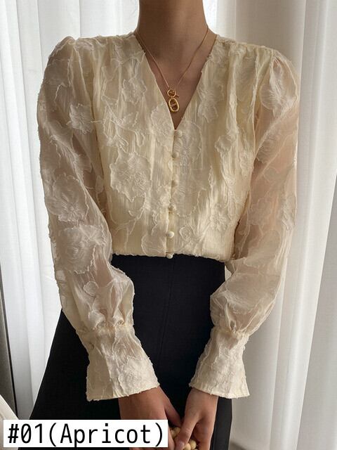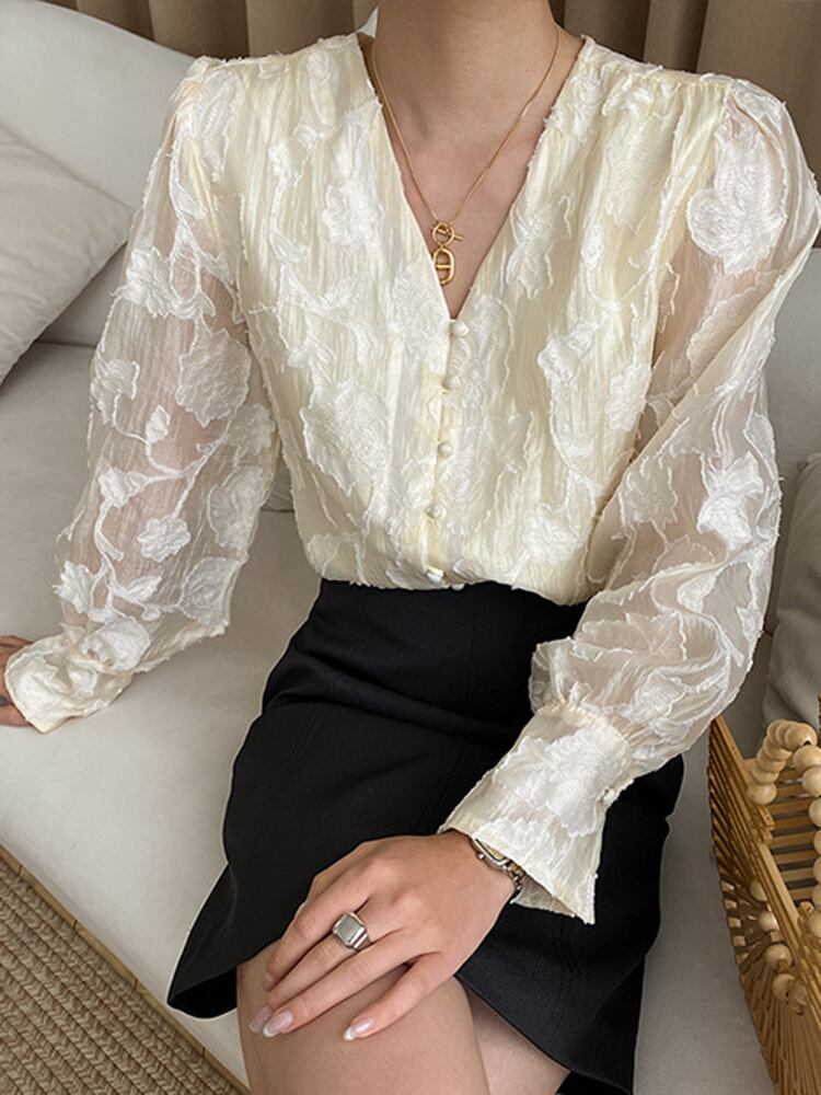 [EWQ] 甘い 3D 刺繍花 V ネックシャツ長袖ルーズ因果シングルブレストトップ春潮トップス ロング 大人ガーリー スウィート キュート カジュアル スプリング 春物 Vネック フラワーデザイン